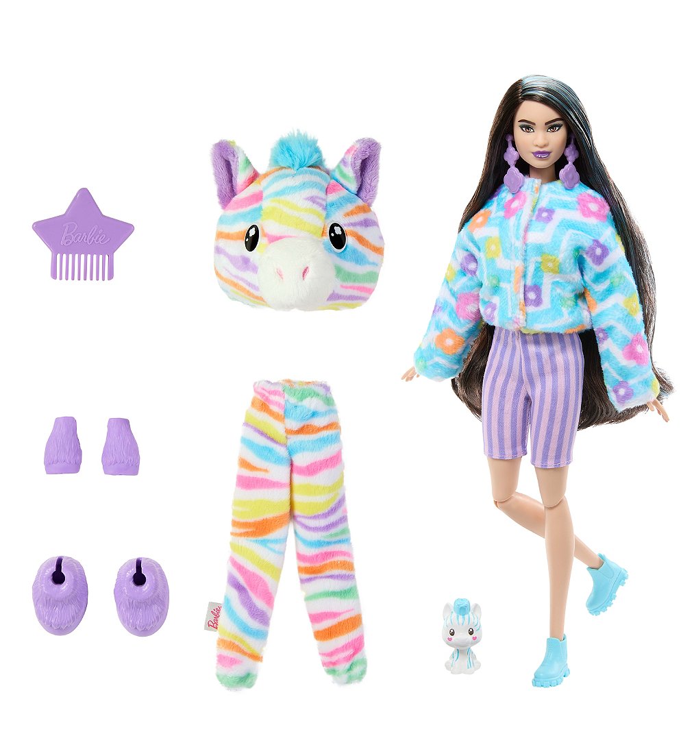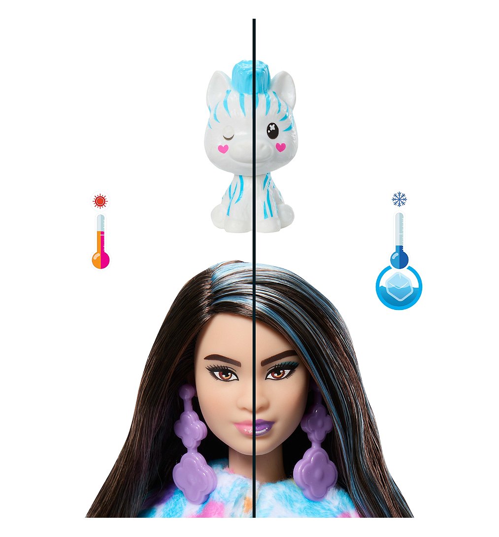 10 surprises sont à découvrir ! 1 Barbie, 2 changements de couleur, 1 déguisement de zèbre tout doux 2 en 1, 1 zébreau et 4 accessoires.