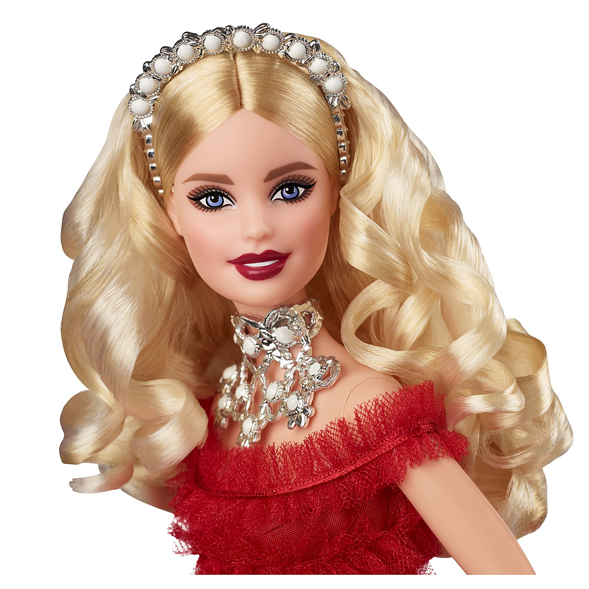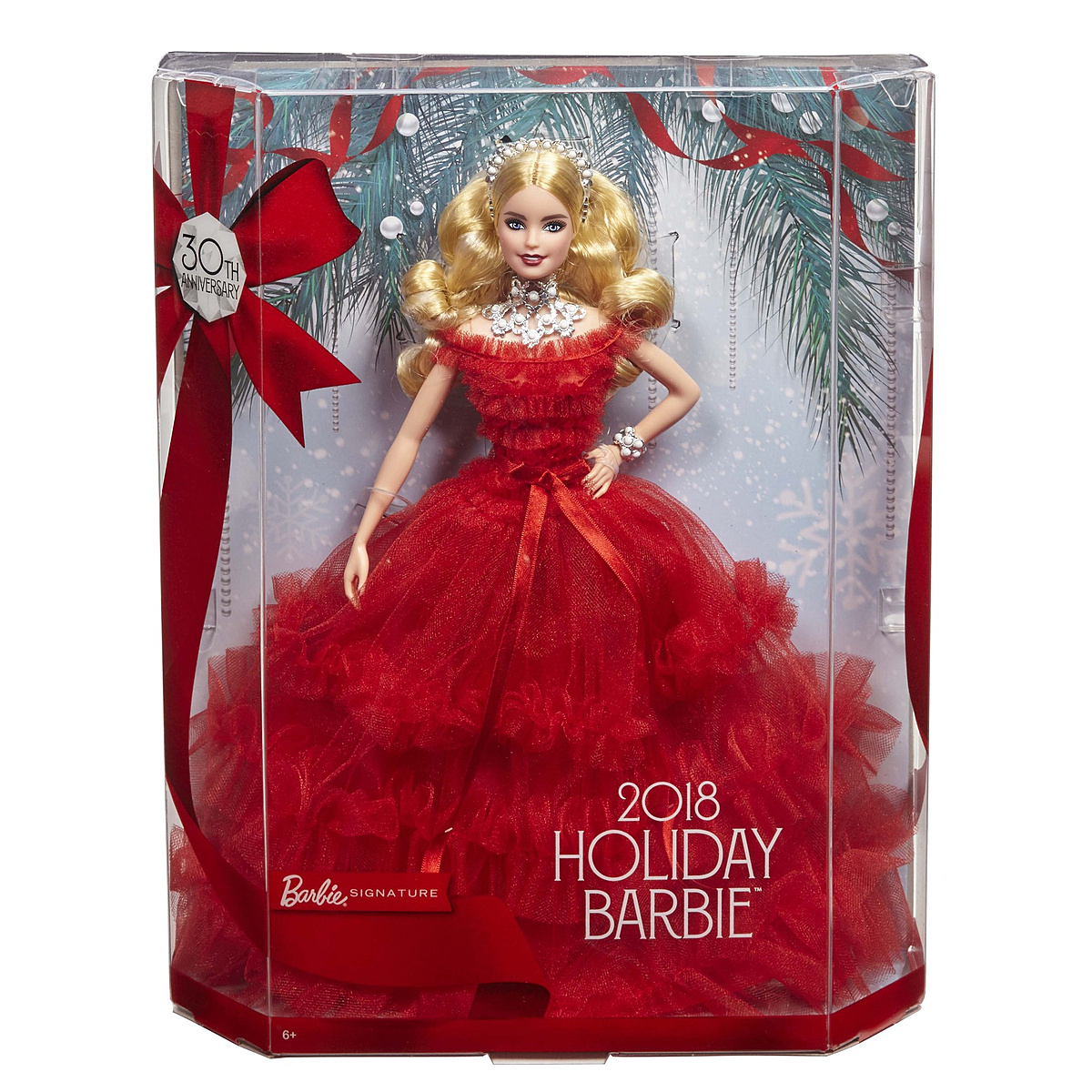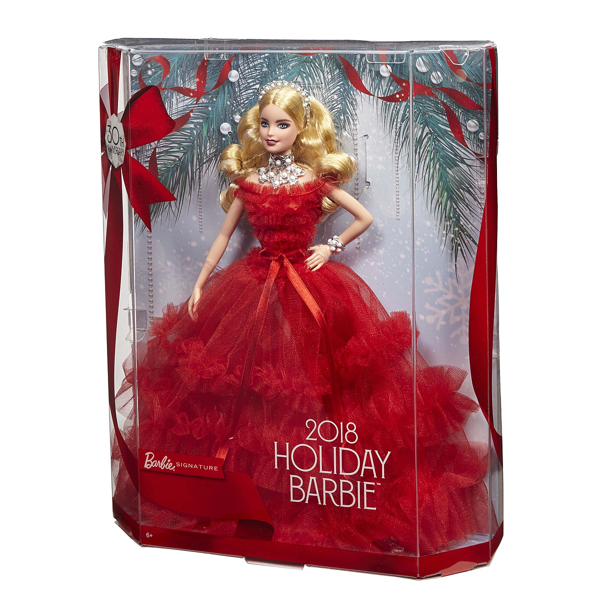 Une ravissante poupée Barbie pour célébrer le 30ème anniversaire de la poupée de Noël. Une robe couleur vermeille cintrée à la taille avec un long jupon évasé et une cascade de volants. 30 perles blanches sont disposées sur son serre-tête, son collier et son bracelet.
