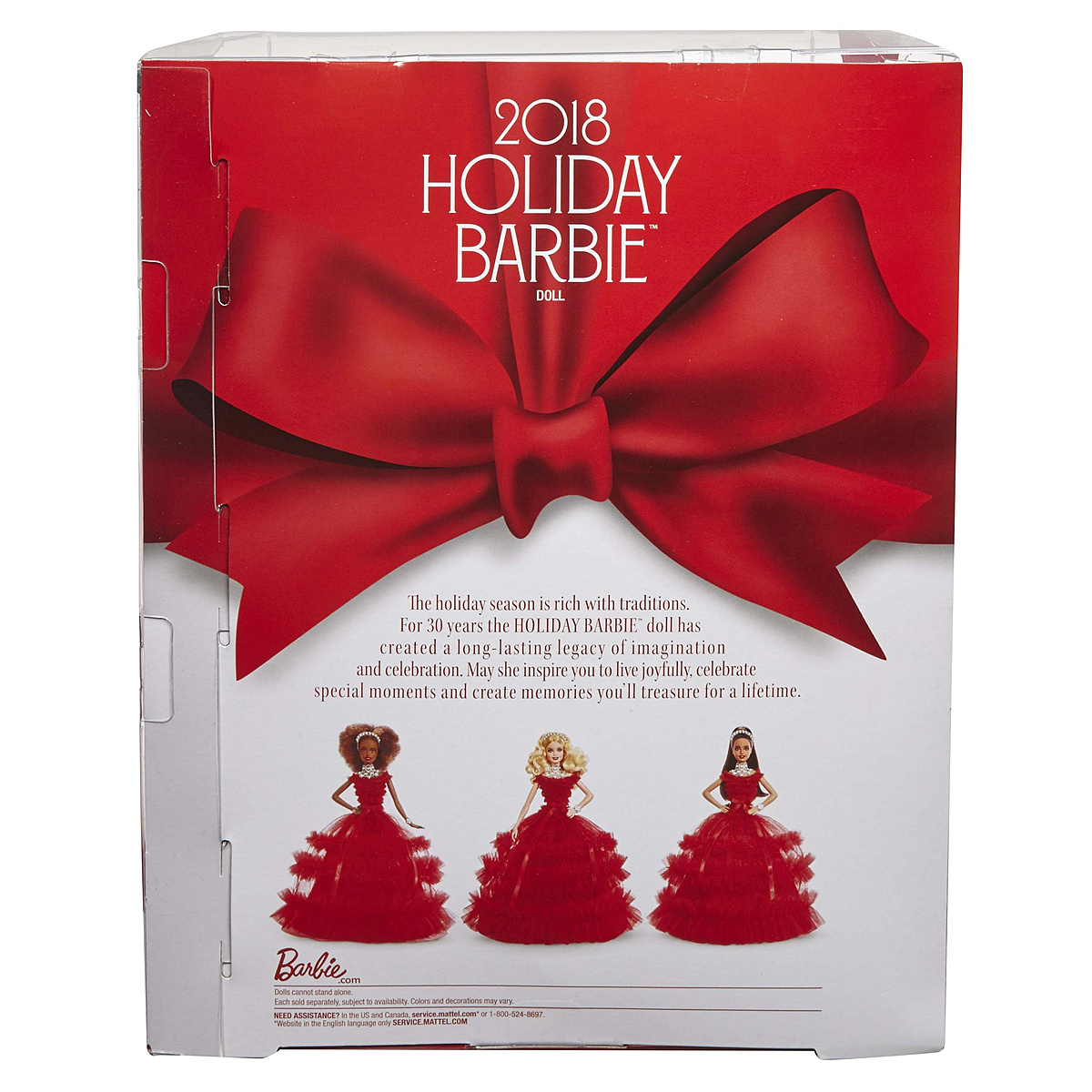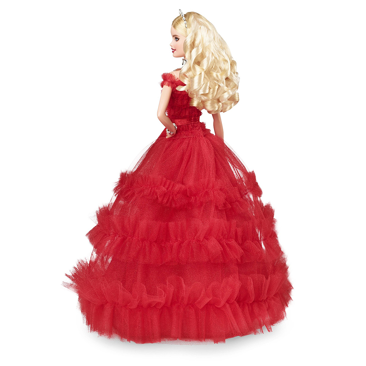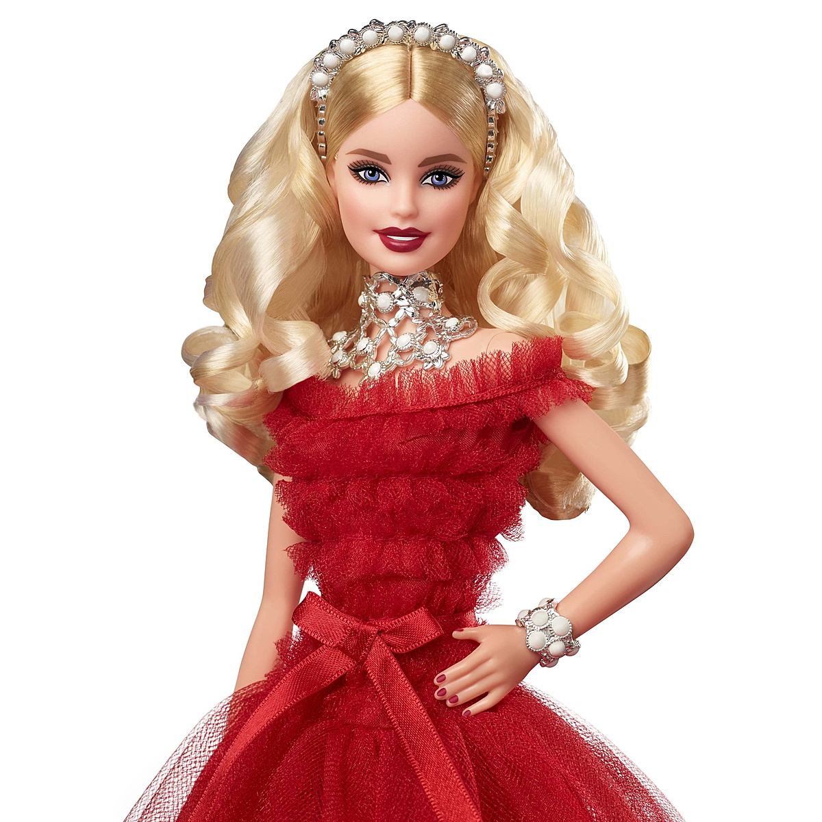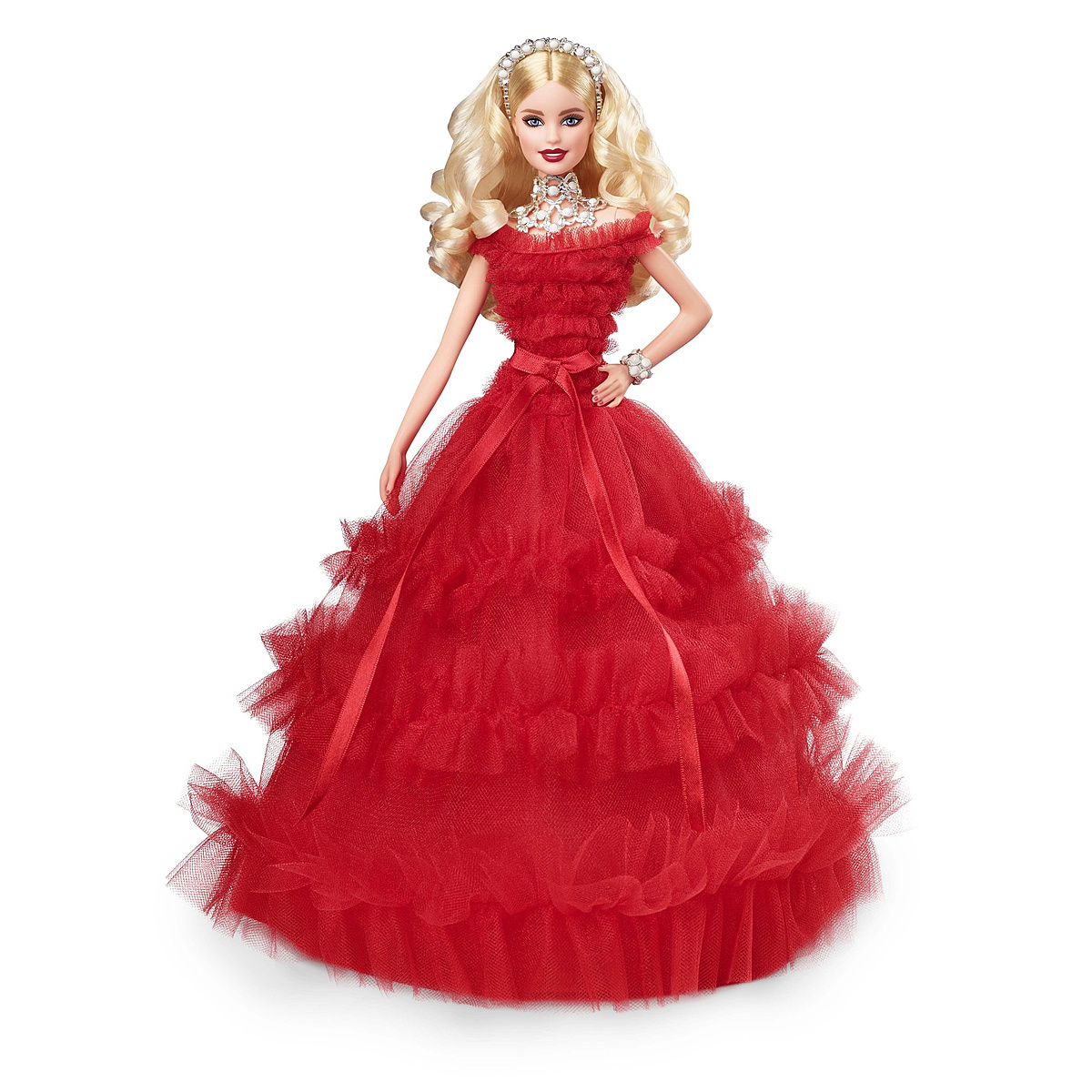 Une ravissante poupée Barbie pour célébrer le 30ème anniversaire de la poupée de Noël. Une robe couleur vermeille cintrée à la taille avec un long jupon évasé et une cascade de volants. 30 perles blanches sont disposées sur son serre-tête, son collier et son bracelet.