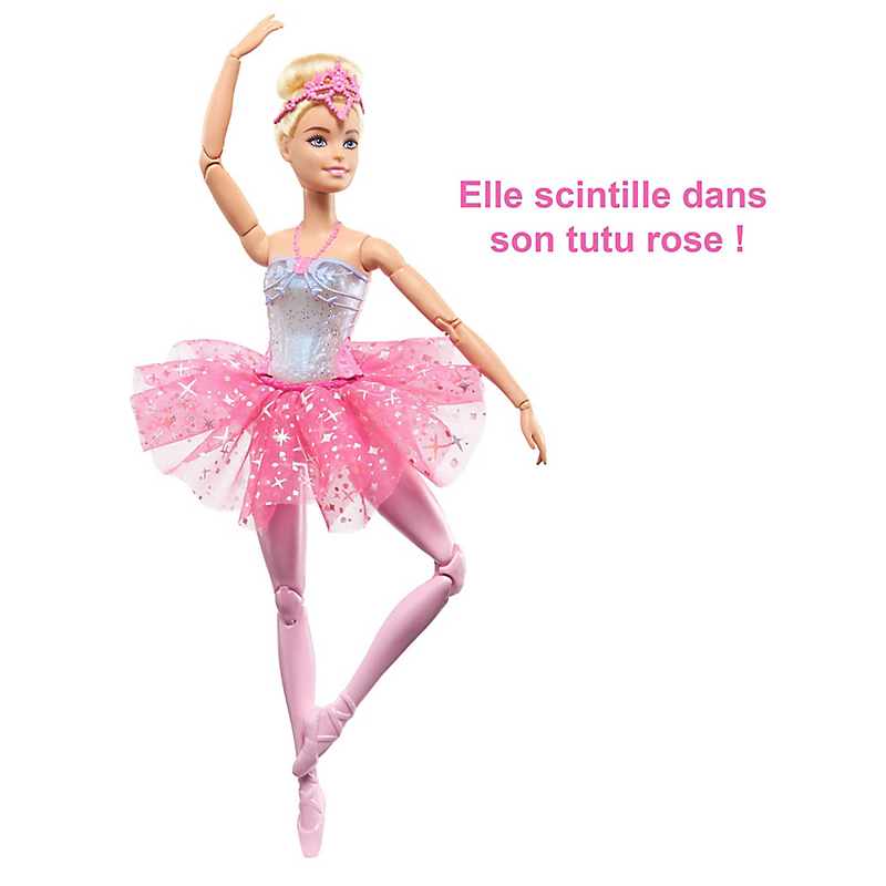 | Plus produit | Tout est plus magique avec la danse classique ! Regardez les poupées Barbie® ballerines briller et scintiller de mille feux lorsquelles dansent.\nCette poupée Barbie® a des cheveux blonds coiffés en un chignon classique et rehaussés dun diadème élégant !\nAppuyez sur le bouton au niveau de la taille de la ballerine pour voir son body silluminer ! Elle est dotée de cinq modes lumineux de différentes couleurs.\nCette poupée Barbie® tournoie avec élégance dans son tutu rose scintillant et ses chaussons de danse travaillés. Elle est articulée pour que les enfants puissent inventer des histoires de danse et lui faire adopter des poses différentes !\nTout est possible dans lunivers fantastique de Barbie® ! Les enfants à partir de 3 ans pourront collectionner les autres poupées et coffrets pour laisser libre cours à leur imagination et explorer tout un monde de possibilités. |
