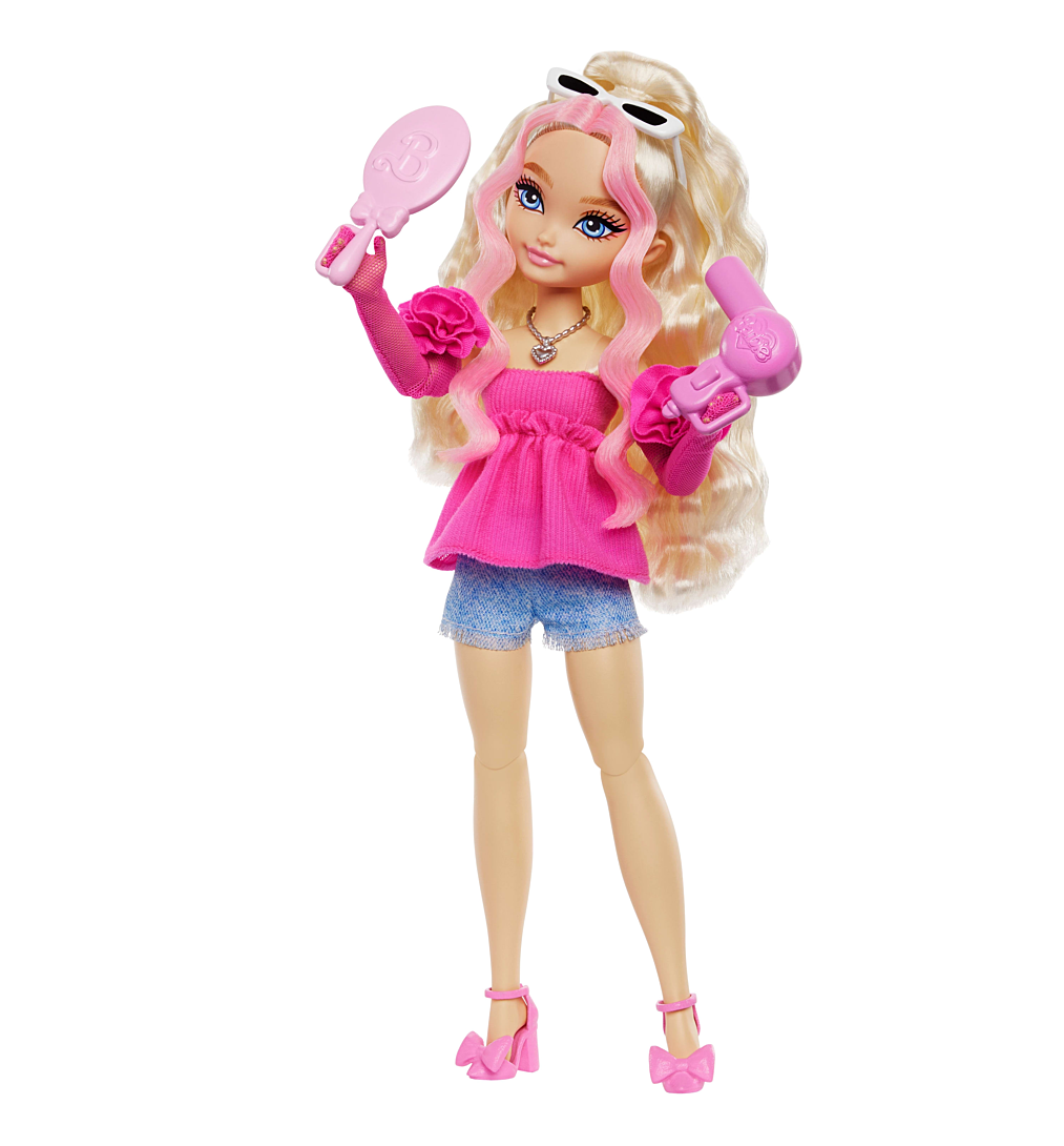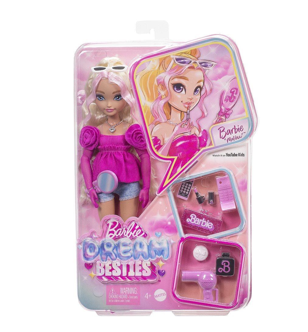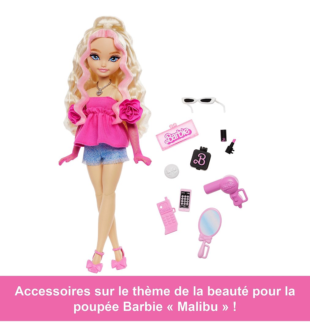 | La boîte contient | Contient 1 poupée Barbie Équipe de rêve « Malibu » portant un haut rose, des gants roses et des chaussures roses, 1 pochette, 1 paire de lunettes de soleil, 1 rouge à lèvres, 1 sèche-cheveux, 1 miroir à main et 4 autres accessoires. La poupée ne tient pas debout toute seule. Les couleurs et les décorations peuvent varier. |