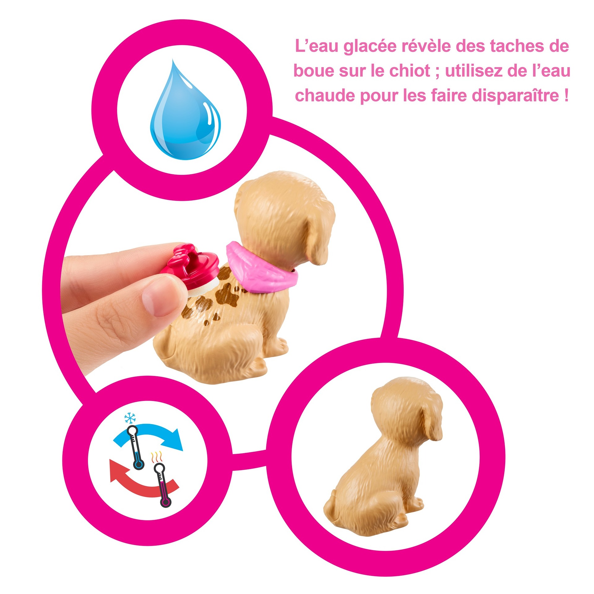Plus produit Le coffret Barbie et son animalerie est un véritable rêve pour tous les amateurs danimaux : il contient 4 animaux, un poste de toilettage, une caisse et plus de 20 pièces sur le même thème ! ,Le décor peut se transformer en quelques secondes : relevez le comptoir pour révéler un bassin où Barbie pourra laver son chiot. ,Pour activer la fonctionnalité de changement de couleur du chiot, utilisez léponge fournie et de leau froide ou tiède pour regarder le petit chien devenir propre ou se salir à nouveau ! ,Le coffret comprend des étagères et des rangements pour des accessoires comme les friandises, les jouets et les accessoires de toilettage. ,Aidez Barbie à faire son shopping pour gâter ses animaux de compagnie ou à adopter un nouveau compagnon ; les animaux supplémentaires sont un chaton, un hamster et une tortue !