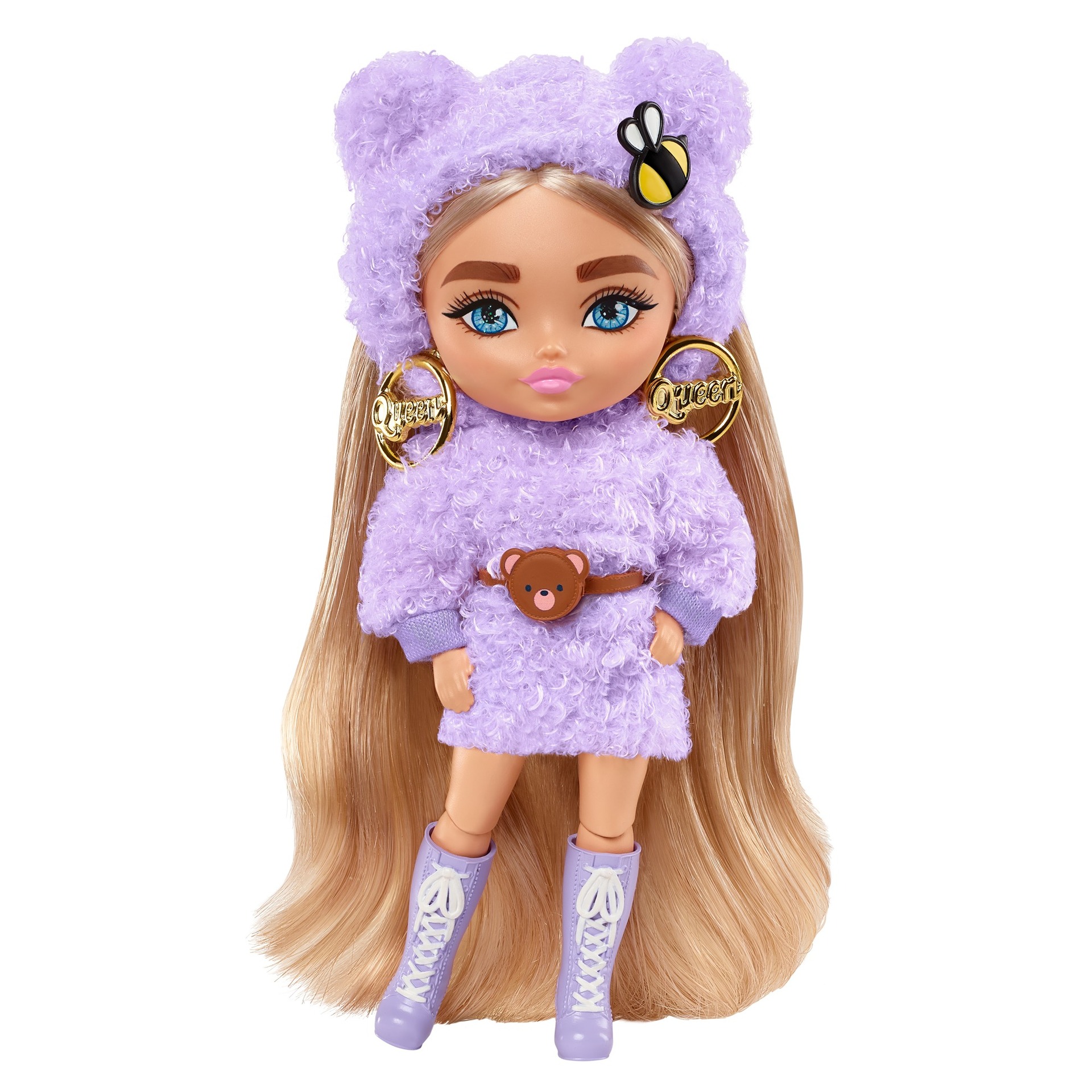 | Plus produit | Les poupées Mini Barbie Extra font 14 cm et ont un look qui en jette, avec une tenue et des accessoires qui sortent du lot. Elles sont aussi fournies avec un socle spécial pour mettre en valeur votre Mini Barbie Extra ! § Cette poupée Mini Barbie Extra a de très longs cheveux blonds et porte une tenue en peluche violette avec oreilles dours assorties. § Plusieurs accessoires complètent sa tenue : des lunettes de soleil en forme de curs, délégantes boucles doreilles, un sac banane nounours et des bottes hautes violettes, pour un look encore plus sensationnel ! § Grâce au socle inclus et à ses coudes et genoux articulés, cette petite poupée est idéale pour imaginer des histoires de mode ou créer une exposition Mini Barbie Extra. § Les poupées Minis Barbie Extra sont un cadeau idéal pour les enfants de 3 à 10 ans, en particulier sils aiment se démarquer ! |