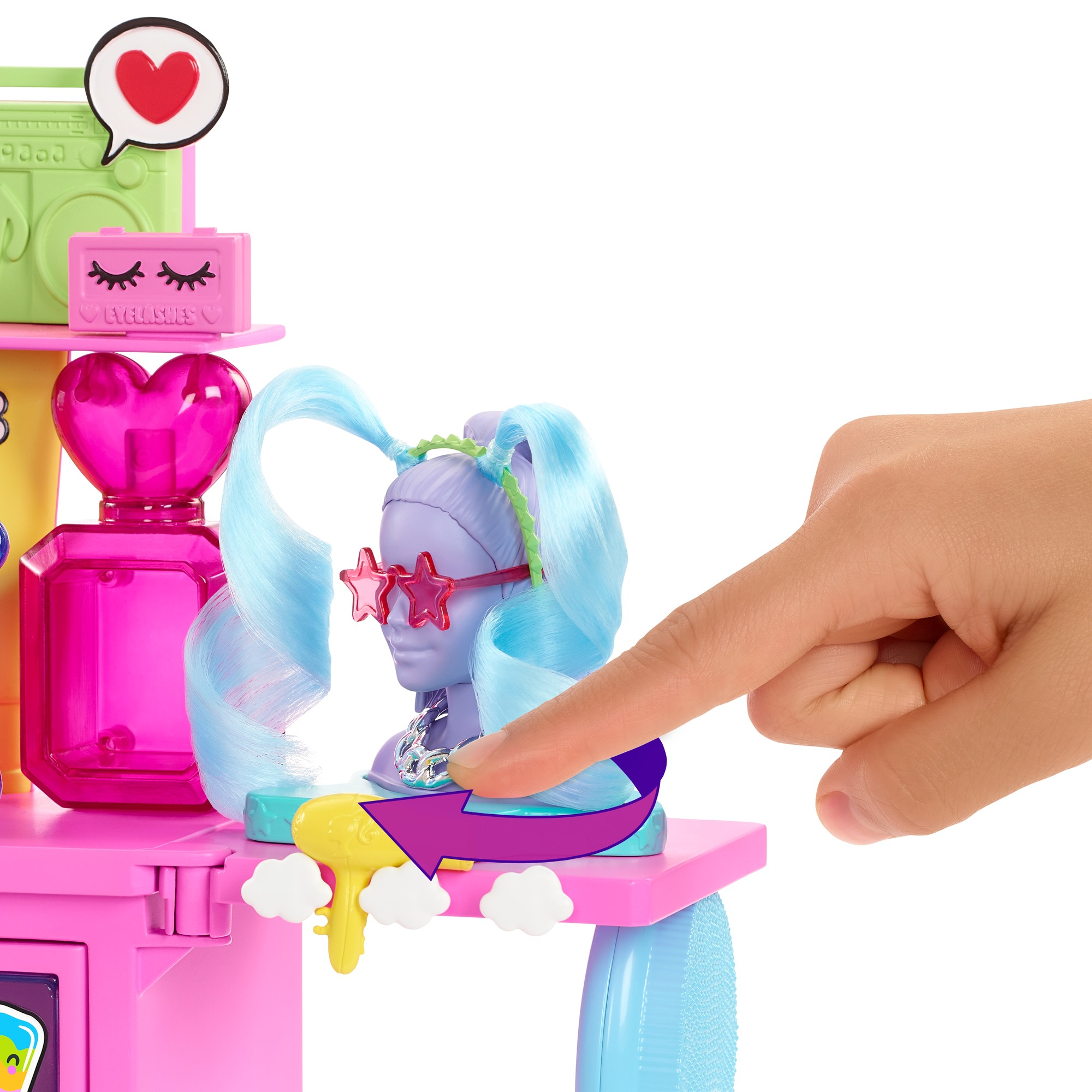 Soyez au top du style avec ce coffret coiffeuse comprenant un miroir lumineux fonctionnel ! C’est le cadre idéal pour élaborer des looks EXTRA-ordinaires. Inventez des histoires sans fin sur le thème de la mode avec plus de 45 éléments de jeu, une poupée Barbie Extra exclusive, un portant à roulettes, des habillages, des accessoires, des extensions de cheveux, un chiot adorable et plus encore ! Une fois la poupée Barbie Extra habillée et parée de ses accessoires, permettez-lui de se contempler dans le miroir de sa coiffeuse, accrochez ses tenues au portant à roulettes à l’aide des cintres signés Barbie Extra ou utilisez la tête de mannequin pour arranger les cheveux et les accessoires. Vous trouverez également un distributeur de friandises pour chien en forme de rouge à lèvres ! Par ailleurs, le coffret fait office de rangement avec de véritables tiroirs, des étagères et des porte-accessoires aux formes amusantes, comme ce support pour parfum et tube de gloss ! Cette poupée Barbie articulée possède des cheveux violets extralongs et porte une tenue à carreaux tendance associée à un manteau de fourrure fluo. Elle fait sensation partout où elle va. D’une allure flamboyante à un look « beauté fatale » : les enfants peuvent mélanger et assortir les éléments fournis pour créer des styles qui leur ressemblent. Éveillez le faiseur de tendances qui sommeille en eux avec ce coffret qui leur permettra de s’imaginer dans les coulisses d’un défilé ou d’un concert ! La poupée ne peut pas tenir debout toute seule. Les couleurs et les décorations peuvent varier.