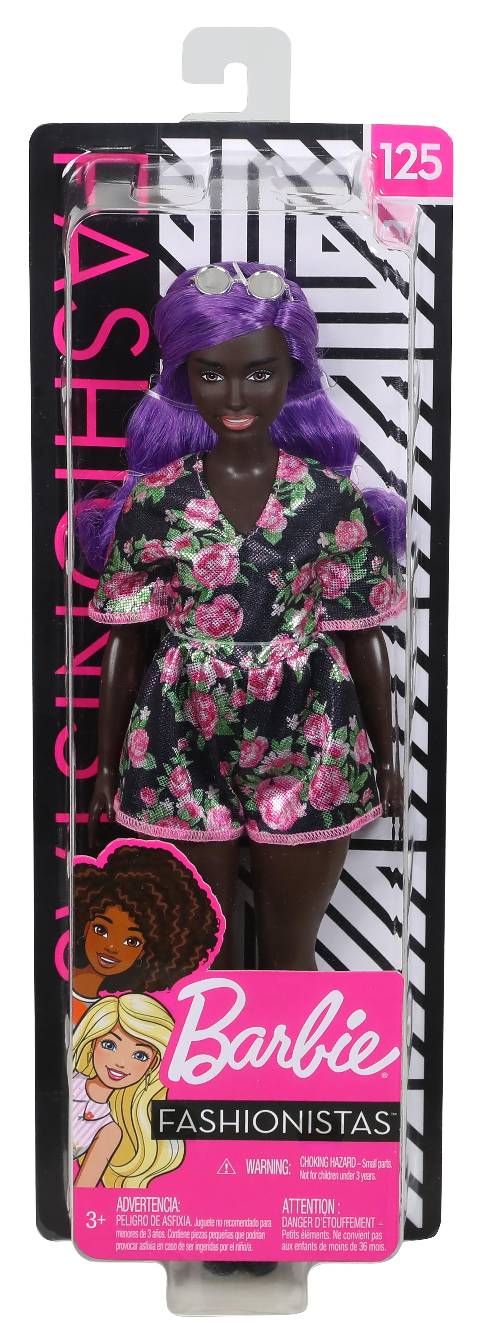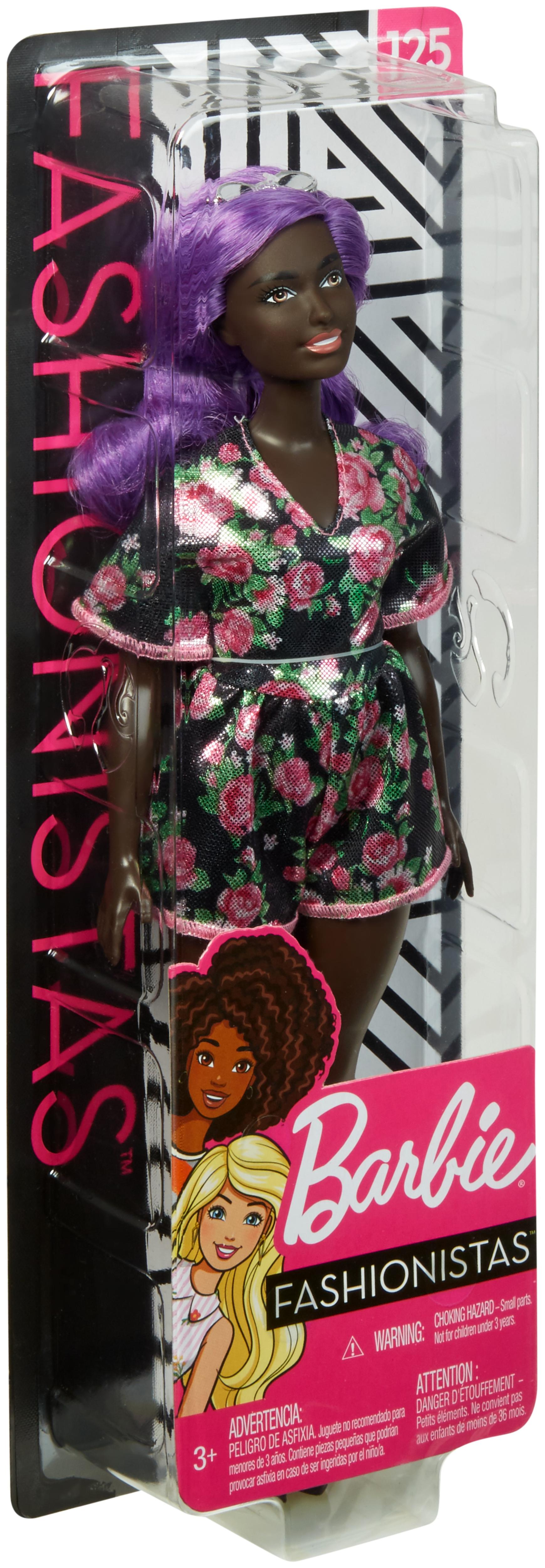 Cette poupée est unique et adopte les nouvelles tendances de la mode. En combishort fleuri, cette Fashionistas porte des cheveux ondulés violets.