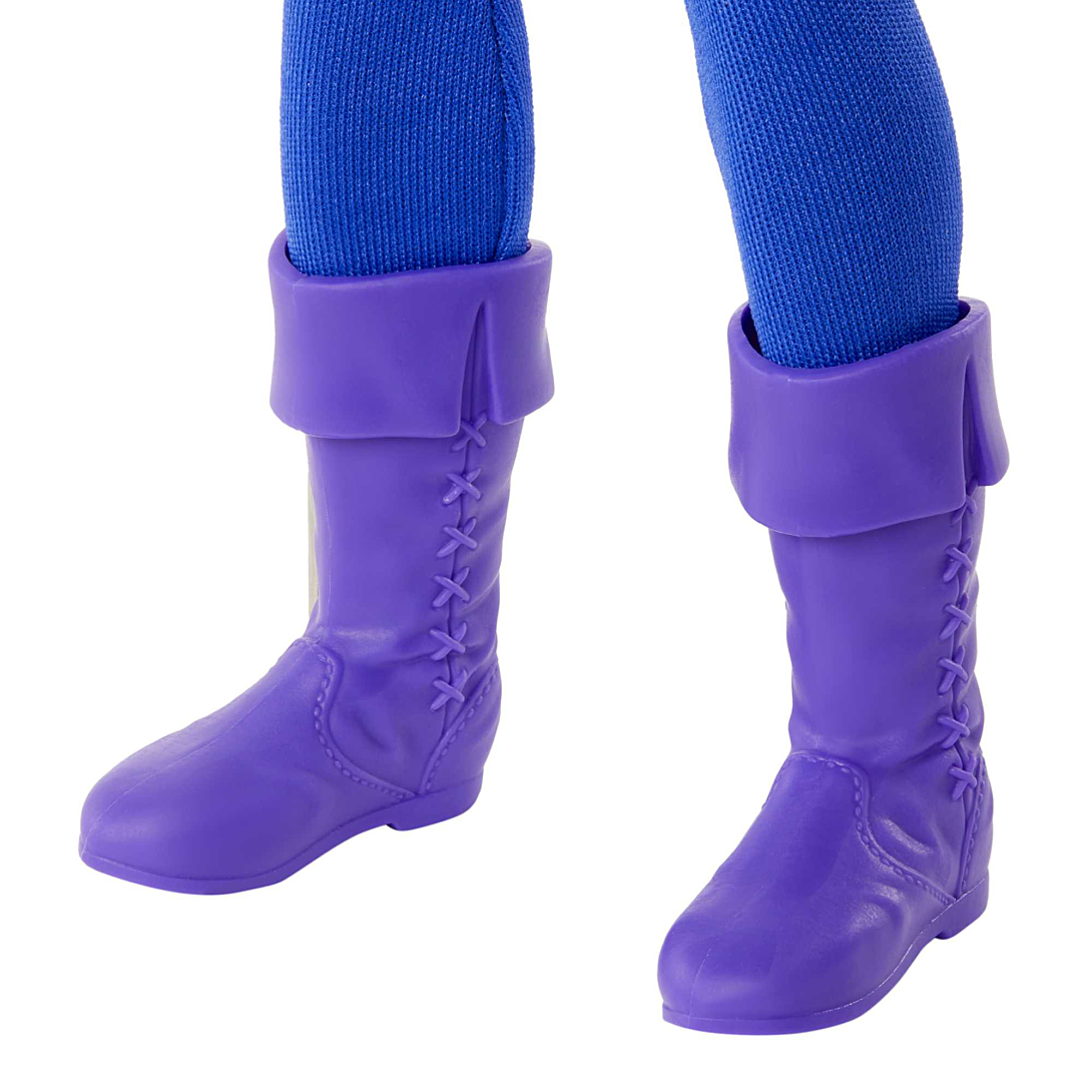 Ken est un prince couronné en tunique et pantalon de satin violet et bleu. Chaussé d’une paire de bottes, il affiche fièrement ses couleurs.
