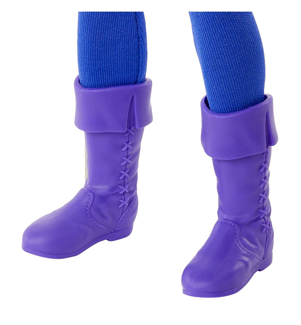 Ken est un prince couronné en tunique et pantalon de satin violet et bleu. Chaussé d’une paire de bottes, il affiche fièrement ses couleurs.