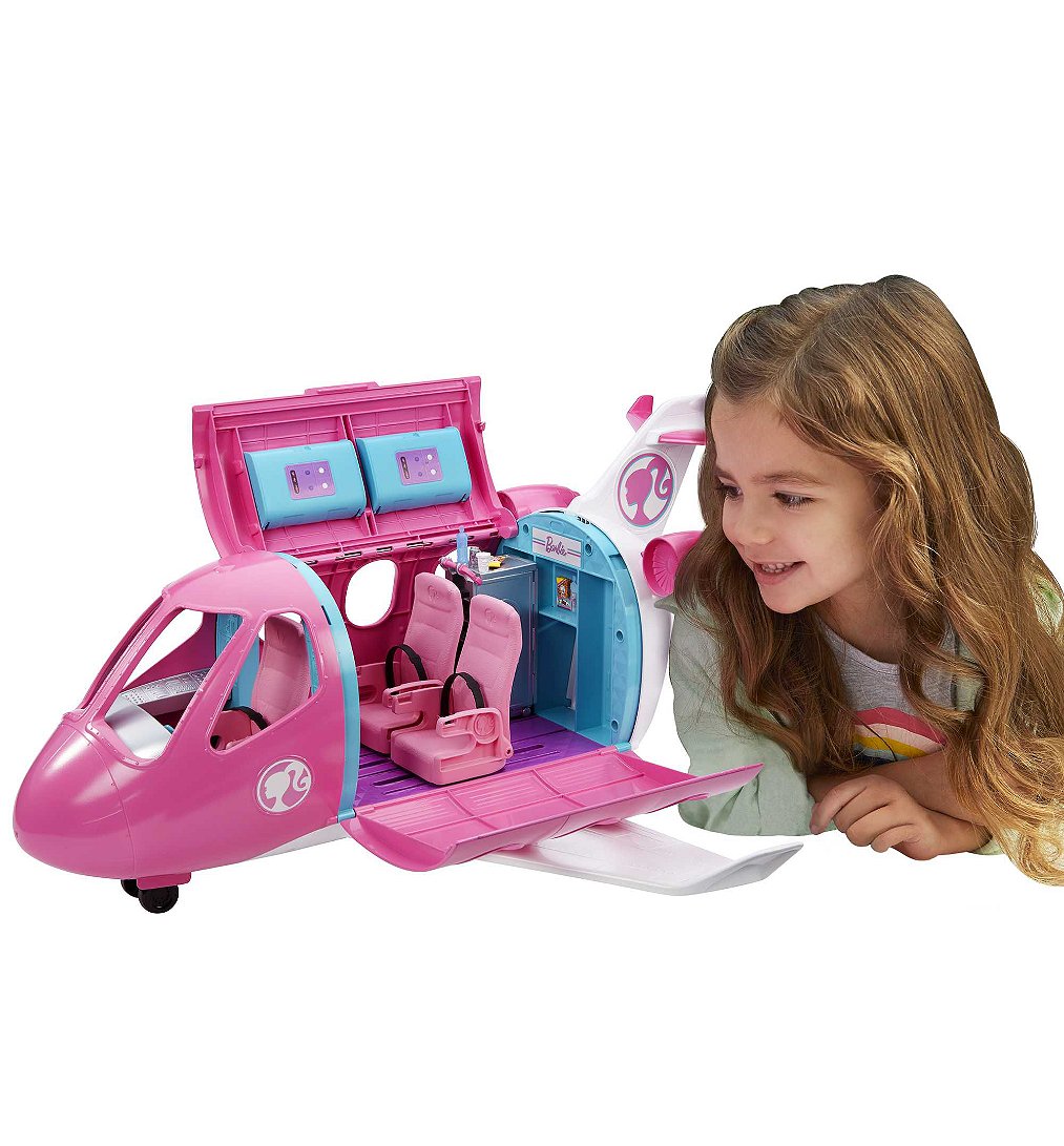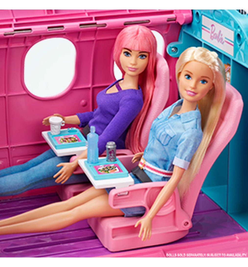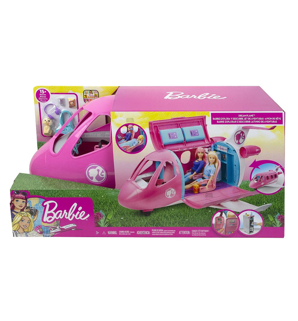 | Plus produit | Avec le coffret Barbie® Avion de Rêve, qui est à la fois un véhicule et un espace de jeu, faites décoller limagination des enfants. À eux de choisir la destination !\nPlus de 15 éléments, dont un chiot pour accompagner Barbie® dans ses voyages, sont lassurance de passer un agréable vol !\nPoussez lavion pour le faire avancer sur la piste de décollage.\nOuvrez le toit et les côtés de lavion pour jouer à lintérieur et imaginer le déroulement du vol !\nLavion comprend un siège pour le pilote et 2 autres pour les passagers, inclinables et avec écran de télévision, comme dans un vrai avion. (Poupées vendues séparément).\nRangez votre valise (qui souvre et se ferme) dans lun des compartiments supérieurs de lavion (qui souvrent et se ferment également) !\nLe chariot de repas nourrira limagination et les passagers : il contient 2 plateaux, 2 repas, des encas et des boissons !\nDautres accessoires ajoutent au réalisme des histoires, comme un magazine, 2 couvertures, un sac de voyage, un masque pour les yeux et des écouteurs.\nExcellente idée de cadeau pour les enfants, en particulier sils aiment voler, voyager et explorer le monde. Leur imagination naura plus de limites, car avec Barbie®, les enfants peuvent être tout ce quils veulent ! |