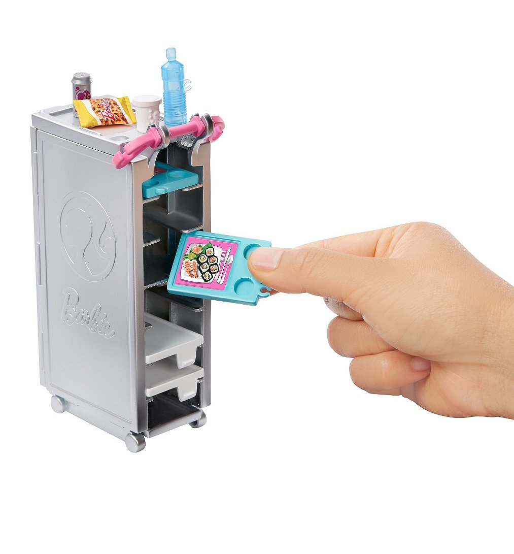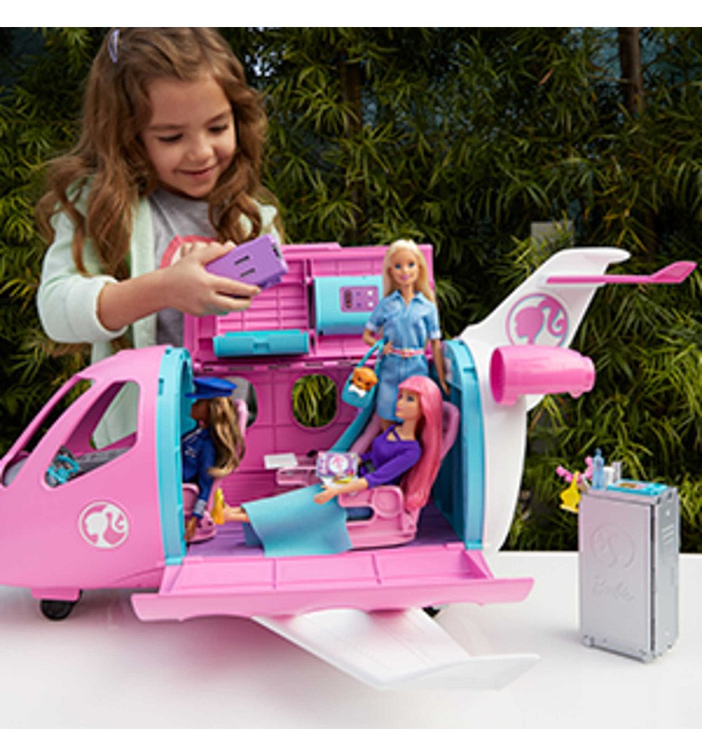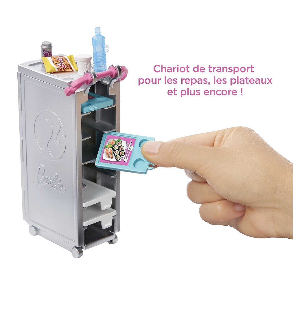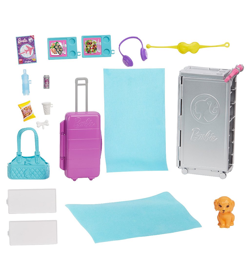 | La boîte contient | Le coffret Barbie® Avion de Rêve contient 1 avion avec roues fonctionnelles (transformable en espace de jeu), 1 chiot, 1 chariot de repas, 2 plateaux, 2 repas, 1 bouteille d’eau, 1 cannette, 1 tasse de café, 1 encas, 1 os pour chien, 1 magazine, 2 couvertures, 1 masque pour les yeux, 1 paire d’écouteurs et 1 valise fonctionnelle. Les couleurs et les décorations peuvent varier. |
