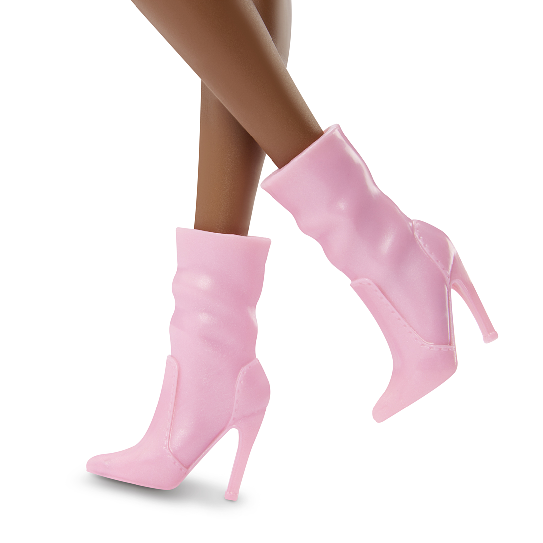 Silhouette élancée et lèvres rose pastel, Barbie prend la pose en bottines et robe rose ajoutant douceur et contraste à ses longs cheveux noirs.