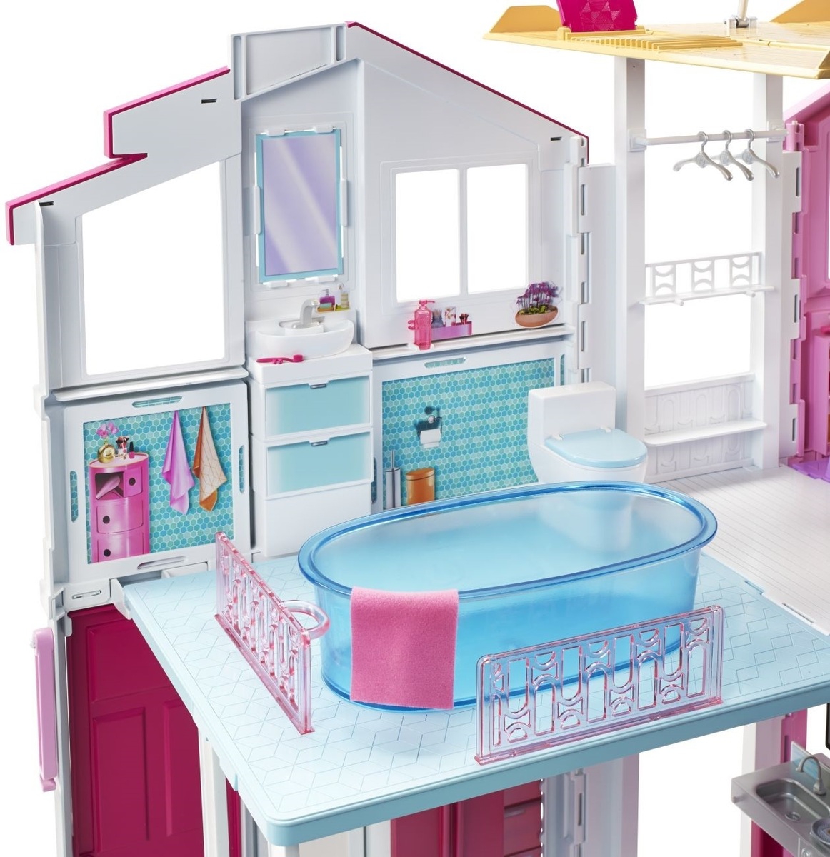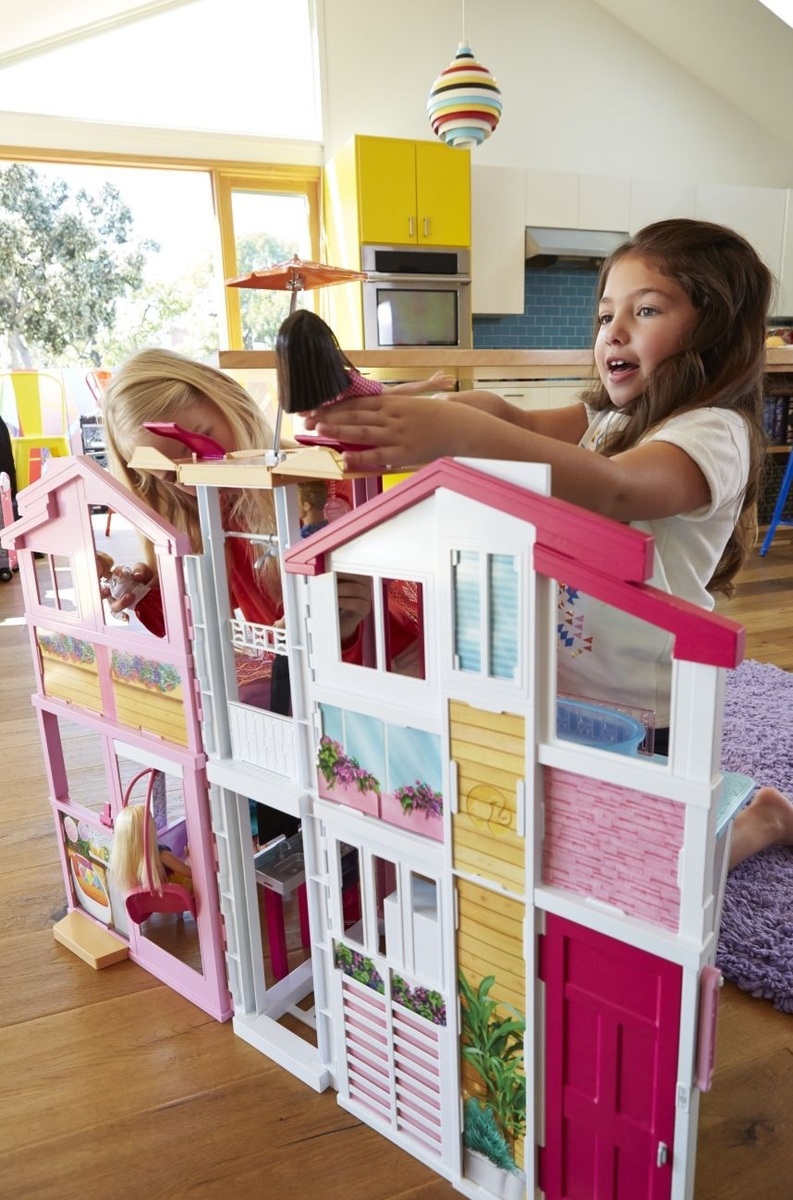 Une grande maison spacieuse, meublée et accessoirisée qui se replie pour le gain de place Poupée vendue séparément.