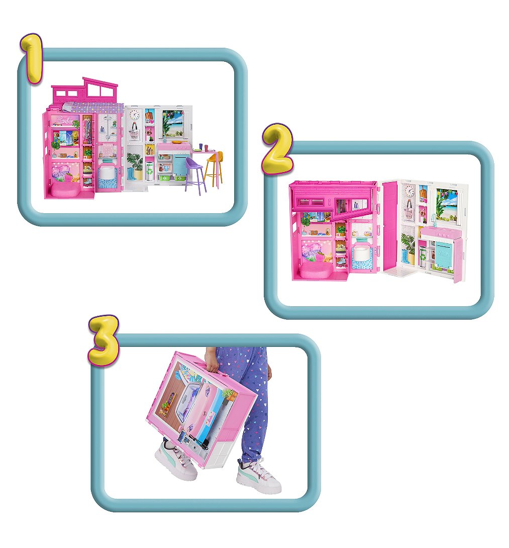 Cette adorable maison de poupée Barbie colorée et pliable représente une source d’inspiration pour de nombreuses aventures amusantes ! Une poupée Barbie et de ravissants accessoires de décoration complètent ce coffret. Avec quatre zones de jeu pour stimuler l’imagination des enfants, notamment une cuisine, une salle de bains, une chambre en mezzanine et un coin cinéma, la Maison de vacances Barbie représente une excellente idée de cadeau pour les enfants à partir de 3 ans ! Les couleurs et les décorations peuvent varier.