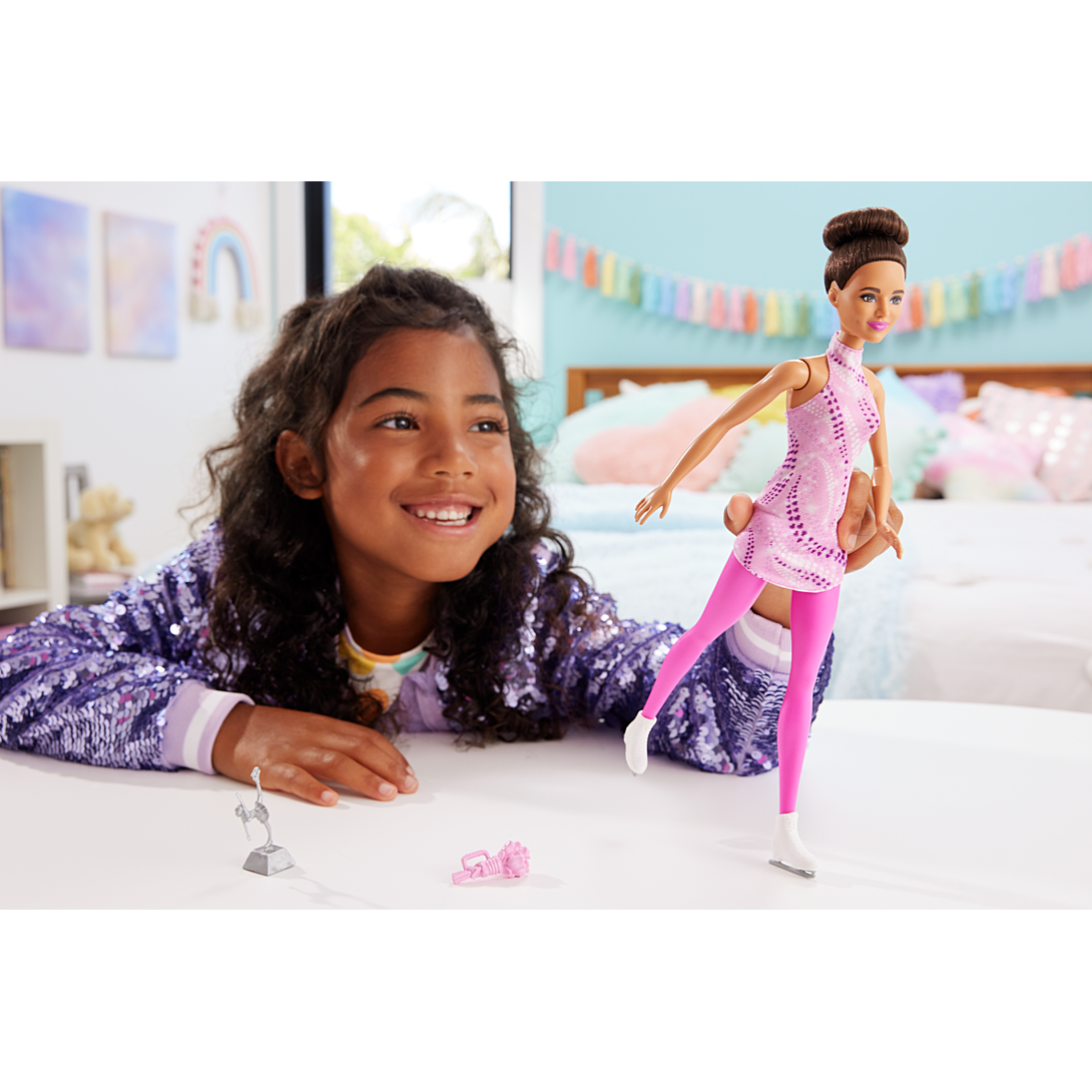 Barbie est sacrée reine de la glace ! Chignon brun sur la tête et tunique rose, 1 paire de patins aux pieds, Barbie remporte trophée et bouquet de fleurs.