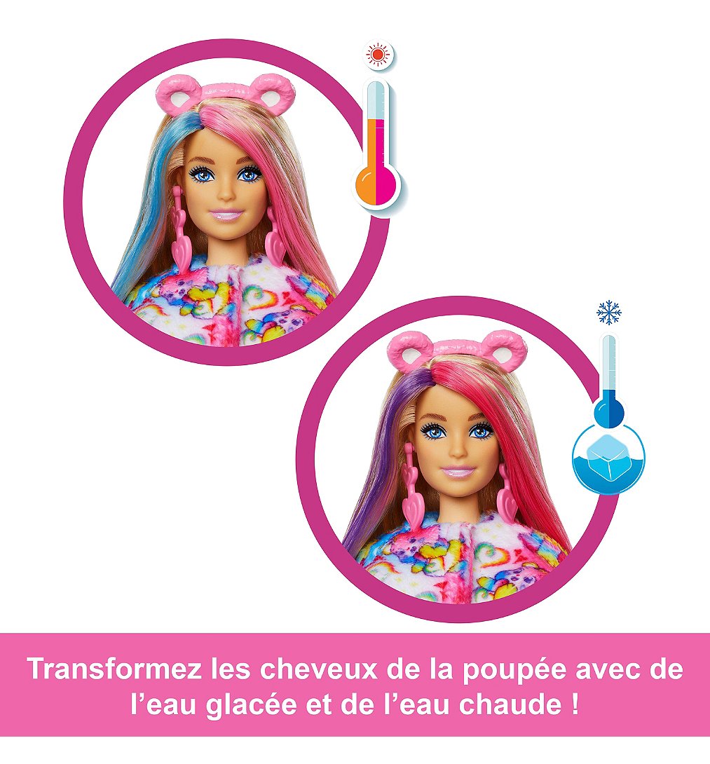 Les poupées Barbie Cutie Reveal Bisounours offrent des moments inoubliables dès l’ouverture lorsqu’on voit les 10 surprises qui les accompagnent ! Découvrez l’un des trois personnages des Bisounours de la deuxième série : l’ours Toutensemble, l’ours Touvaillante ou l’ours Touradieuse. Retirez l’adorable costume en peluche pour dévoiler une poupée Barbie articulée. Quelle poupée allez-vous découvrir ? Découvrez d’autres surprises comme une jupe, un serre-tête, des boucles d’oreilles, une paire de bottines ou de chaussures, un peigne-éponge et une mini-figurine Bisounours assortie ! Retournez la veste en peluche pour en faire une veste polaire. La tête du costume se transforme en petit lit pour le mini-animal. Pour un côté encore plus mignon, utilisez de l’eau pour changer la couleur sur le visage de la poupée ! Les enfants vont adorer découvrir et collectionner toutes les jolies surprises de cette adorable série. Chaque poupée est vendue séparément. Certains produits peuvent ne pas être commercialisés. Les poupées ne tiennent pas debout toutes seules. Les couleurs et les décorations peuvent varier.