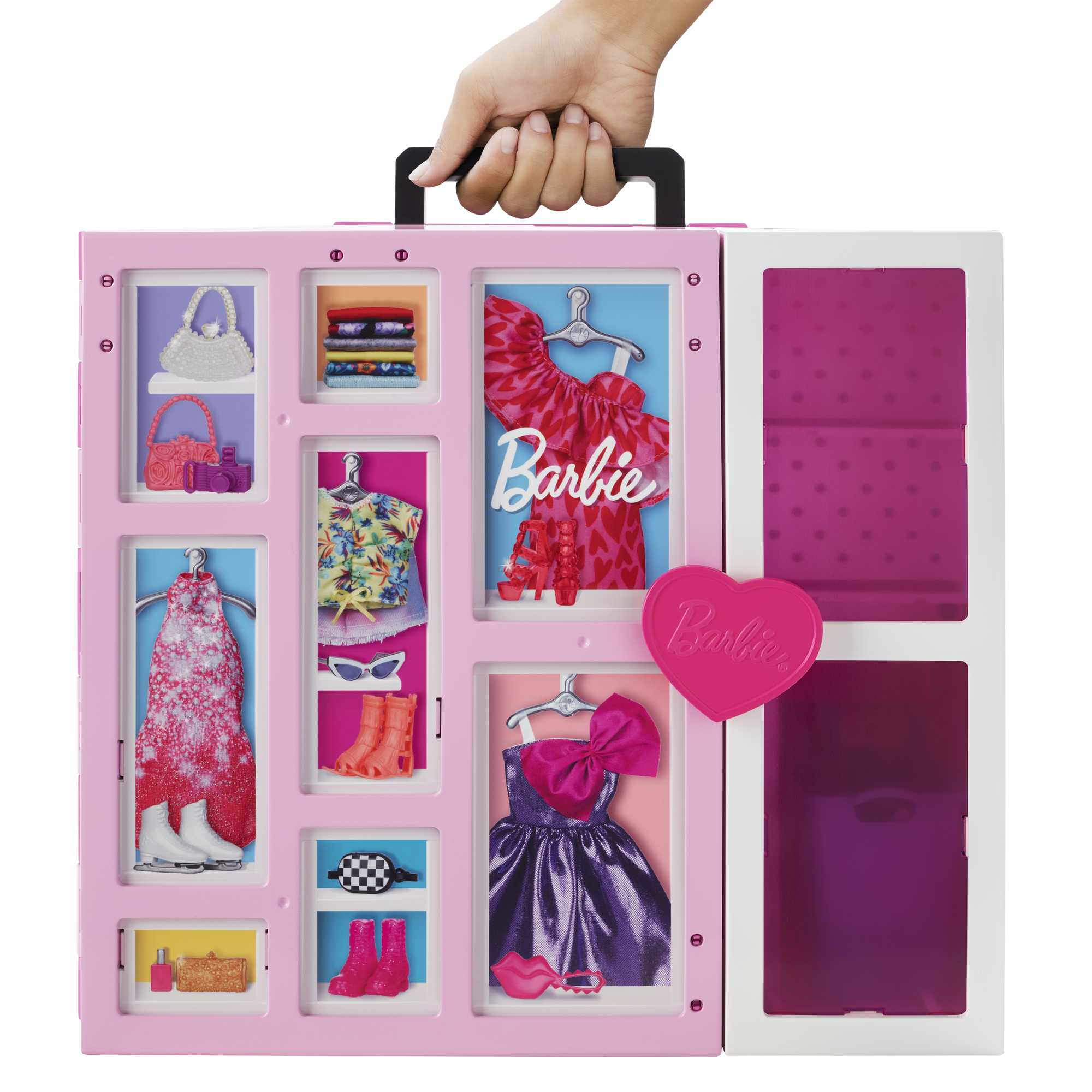 Le Dressing Deluxe de Barbie® inspirera aux enfants une multitude d’histoires et de looks ! Ce dressing rose moderne s’ouvre sur plus de 60 cm et comporte plus de 15 espaces de rangement, avec une penderie escamotable qui forme un deuxième niveau, un vide-linge, un miroir en pied et un coin bureau. Une poupée Barbie® est incluse, ainsi qu’une trentaine de tenues et accessoires. Les enfants pourront utiliser le socle de la poupée et le miroir pour mieux relooker Barbie, mettre le linge sale dans le vide-linge puis profiter du coin bureau pour inventer encore plus d’histoires. Le coffret comprend quatre tenues complètes, dont des accessoires, adaptées à toutes les occasions : une tenue tendance à porter le jour, une autre pour sortir le soir, une tenue d’infirmière et une tenue de maître-nageuse. Et quand ils ont fini de jouer, les enfants peuvent tout ranger et refermer le dressing pour mieux l’emporter partout ! Une jolie poignée facilite le transport. La poupée ne tient pas debout toute seule. Les couleurs et les décorations peuvent varier. À partir de 3 ans.