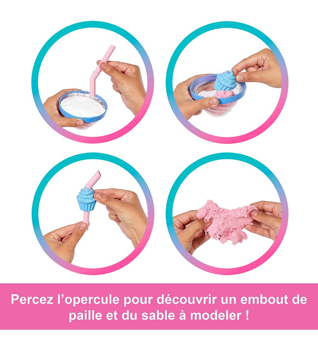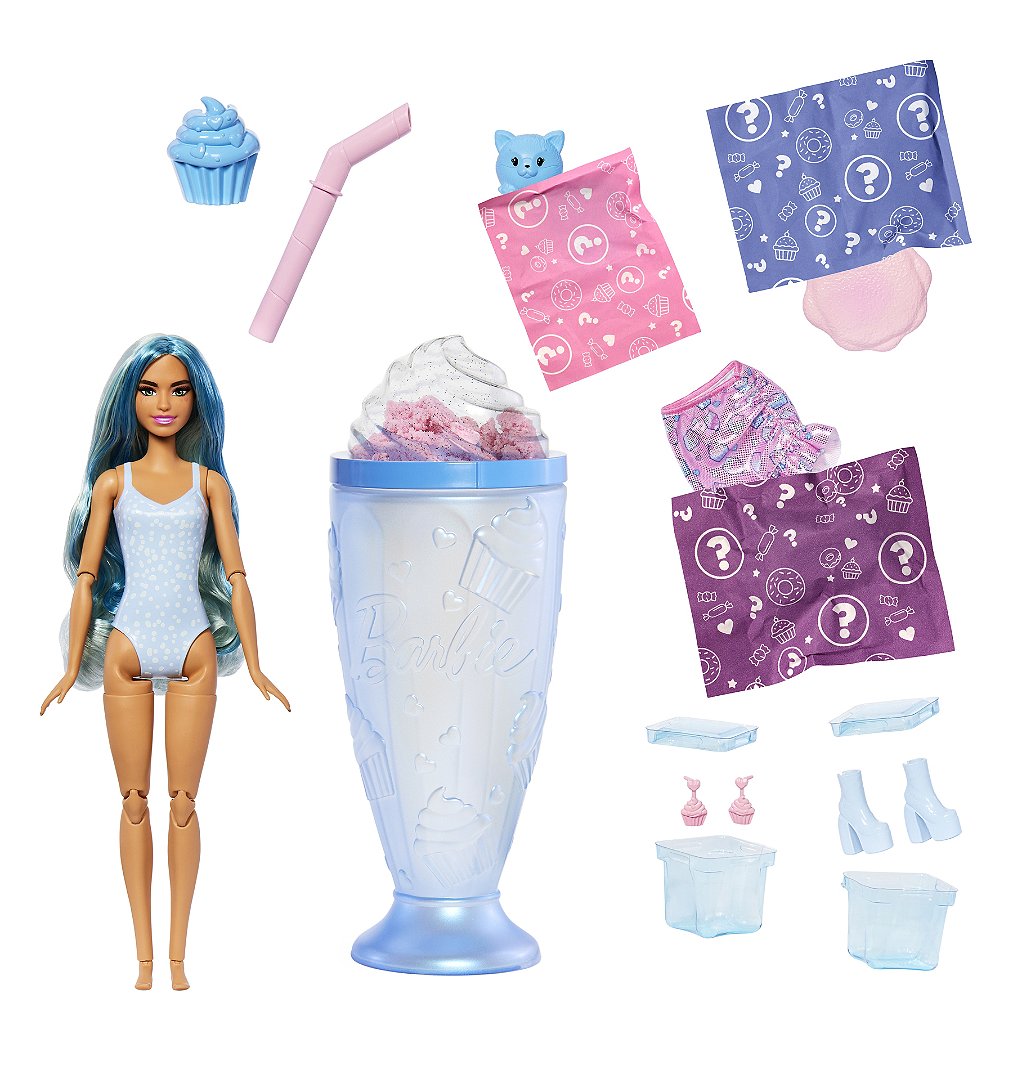 Les poupées Barbie Pop Reveal issues de la série Treat offrent une expérience de déballage sensorielle avec huit surprises à découvrir, placées à l’intérieur d’un gobelet décoré de friandises ! Dévissez le couvercle (en forme de nappage de crème chantilly !) pour découvrir du sable à modeler et percez l’opercule avec la paille pour vous amuser avec la substance souple. Décollez l’opercule du gobelet pour révéler une poupée Barbie au parfum sucré et six autres surprises ! Quelle poupée allez-vous découvrir ? Délices de donuts, Cupcakes à croquer ou Spirales sucrées ? Continuez le déballage pour découvrir deux glaçons réutilisables qui s’ouvrent pour révéler des boucles d’oreilles sur le même thème et une paire de chaussures ou de bottes. Les sachets mystères contiennent une jupe colorée, un animal de compagnie souple et parfumé et son lit assorti. Laissez-vous émerveiller par l’incroyable changement de couleur sur le visage de la poupée Barbie ! Vous allez vouloir tous les collectionner. Chaque poupée est vendue séparément. Certains produits peuvent ne pas être commercialisés. Les poupées ne tiennent pas debout toutes seules. Les couleurs et les décorations peuvent varier.