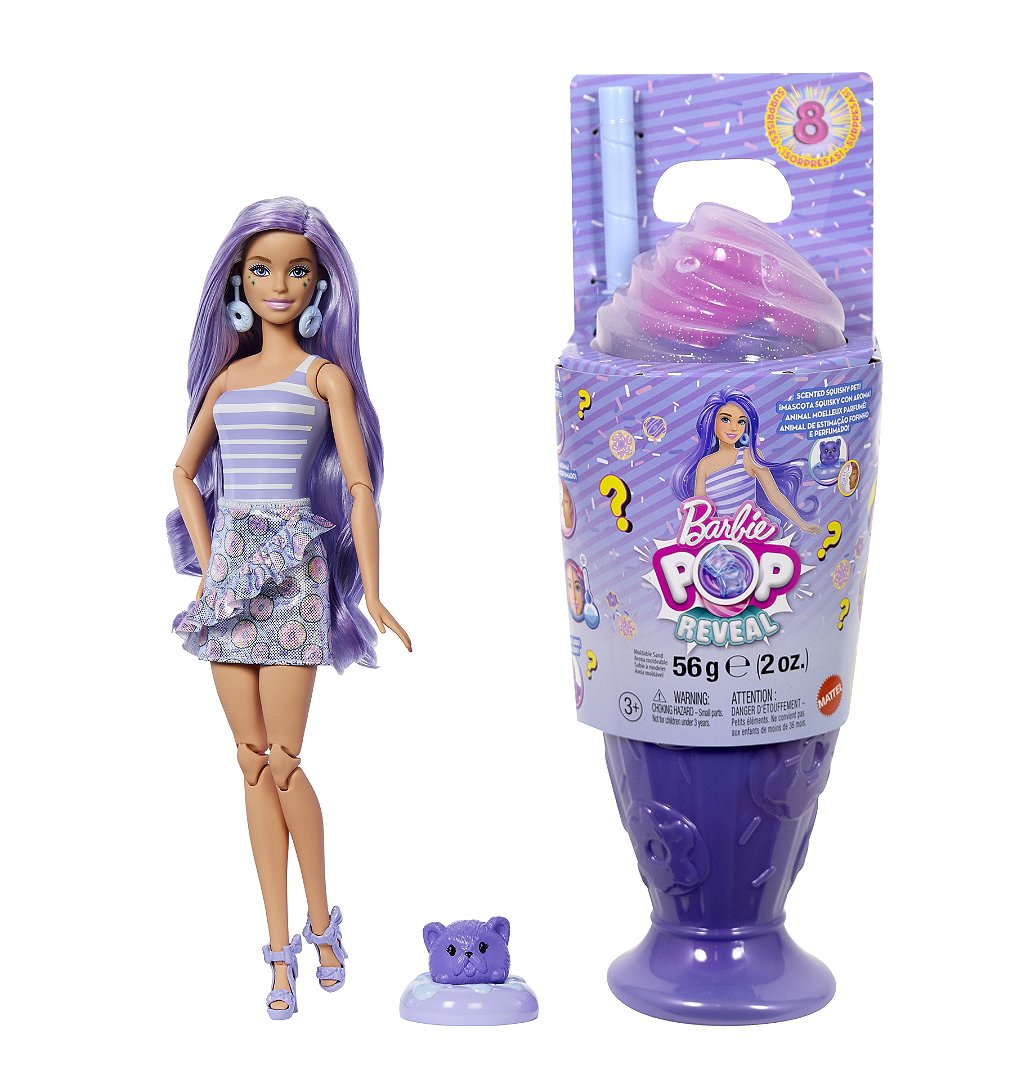 Les poupées Barbie Pop Reveal issues de la série Treat offrent une expérience de déballage sensorielle avec huit surprises à découvrir, placées à l’intérieur d’un gobelet décoré de friandises ! Dévissez le couvercle (en forme de nappage de crème chantilly !) pour découvrir du sable à modeler et percez l’opercule avec la paille pour vous amuser avec la substance souple. Décollez l’opercule du gobelet pour révéler une poupée Barbie au parfum sucré et six autres surprises ! Quelle poupée allez-vous découvrir ? Délices de donuts, Cupcakes à croquer ou Spirales sucrées ? Continuez le déballage pour découvrir deux glaçons réutilisables qui s’ouvrent pour révéler des boucles d’oreilles sur le même thème et une paire de chaussures ou de bottes. Les sachets mystères contiennent une jupe colorée, un animal de compagnie souple et parfumé et son lit assorti. Laissez-vous émerveiller par l’incroyable changement de couleur sur le visage de la poupée Barbie ! Vous allez vouloir tous les collectionner. Chaque poupée est vendue séparément. Certains produits peuvent ne pas être commercialisés. Les poupées ne tiennent pas debout toutes seules. Les couleurs et les décorations peuvent varier.