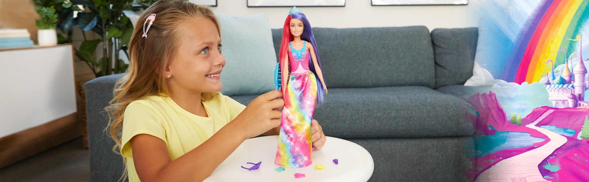 | Plus produit | Cette poupée Barbie Royal Dreamtopia inspirera des histoires et des looks originaux avec ses cheveux multicolores extra-longs et les accessoires qui vont avec.\nBrossez la longue chevelure colorée de cette Barbie® Royal, puis choisissez son look du jour pour vivre de nouvelles aventures enchantées !\nLes accessoires de coiffure comprennent une brosse à cheveux, 2 Accessoire pour cheveuxs, 2 barrettes et 2 peignes décoratifs, pour une multitude de looks.\nCette Barbie® Royal porte un corsage à paillettes décoré de « joyaux » et une longue jupe de Royal amovible.\nCette poupée Dreamtopia fera un super cadeau pour les enfants à partir de 3 ans, surtout sils aiment la coiffure et les Royals ! |