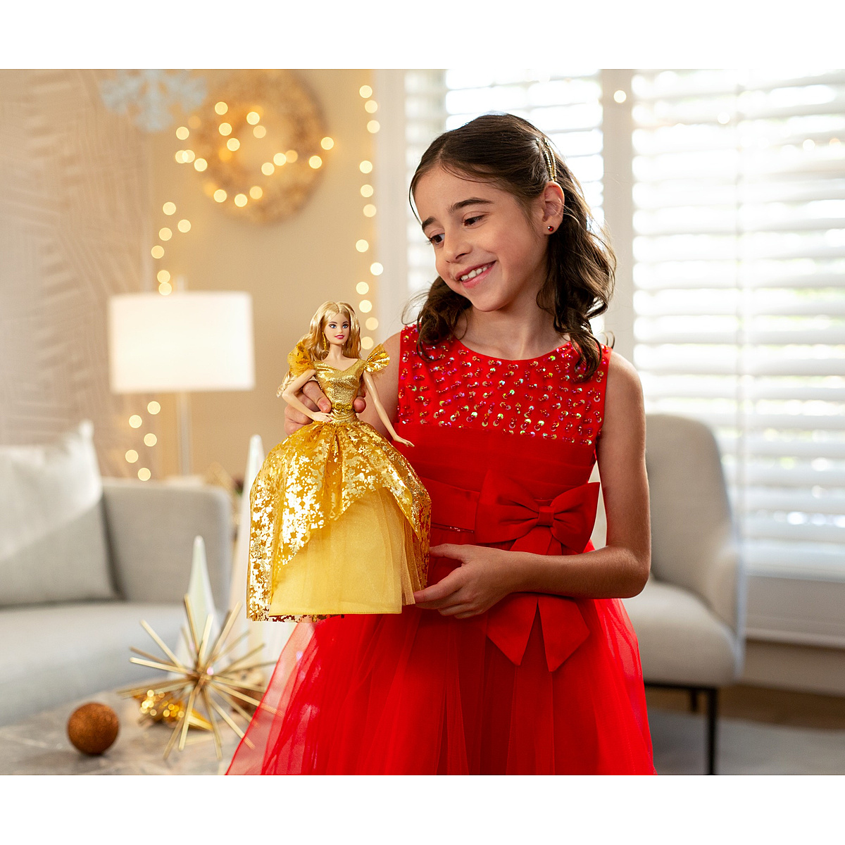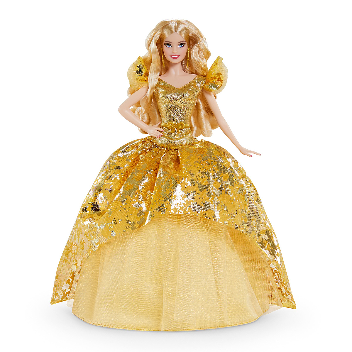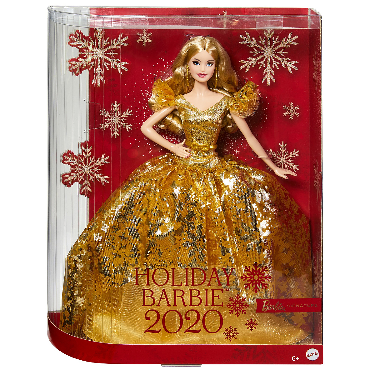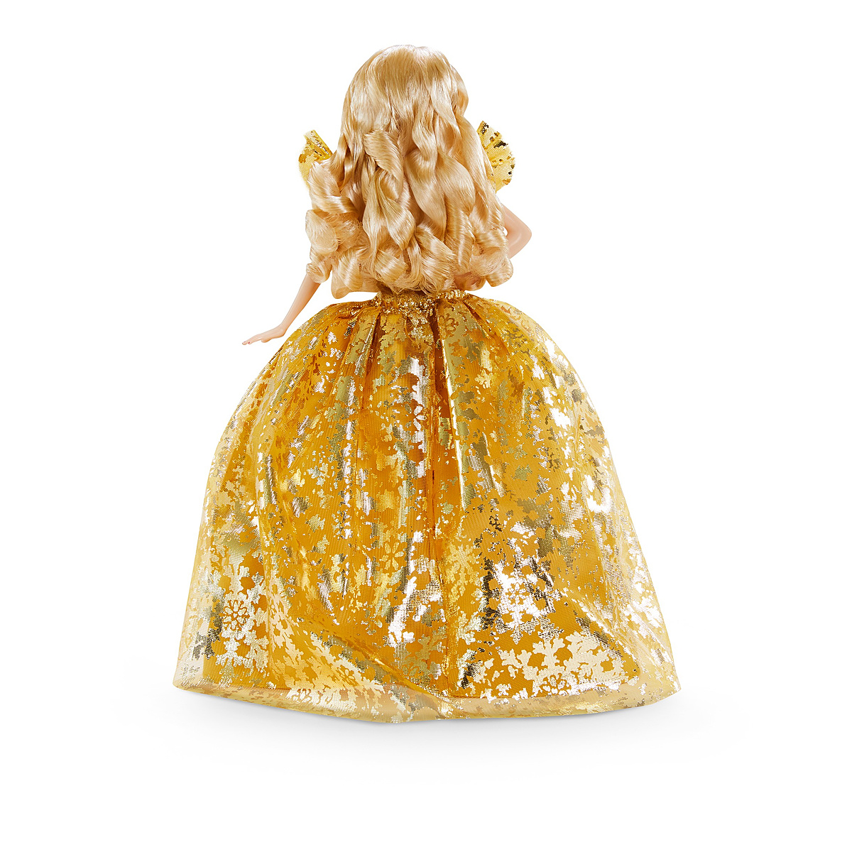 Barbie fête Noël dans la plus grande tradition du scintillement et des flocons. Barbie porte une robe ballon métallisée de couleur or. Son jupon de satin est étoffé de tulle et dun voile imprimé qui évoque le papier métallisé orné de flocons dorés. Elle porte des cheveux longs, de longs pendentifs dorés et son fard à paupière sinspire de léclat de sa robe.