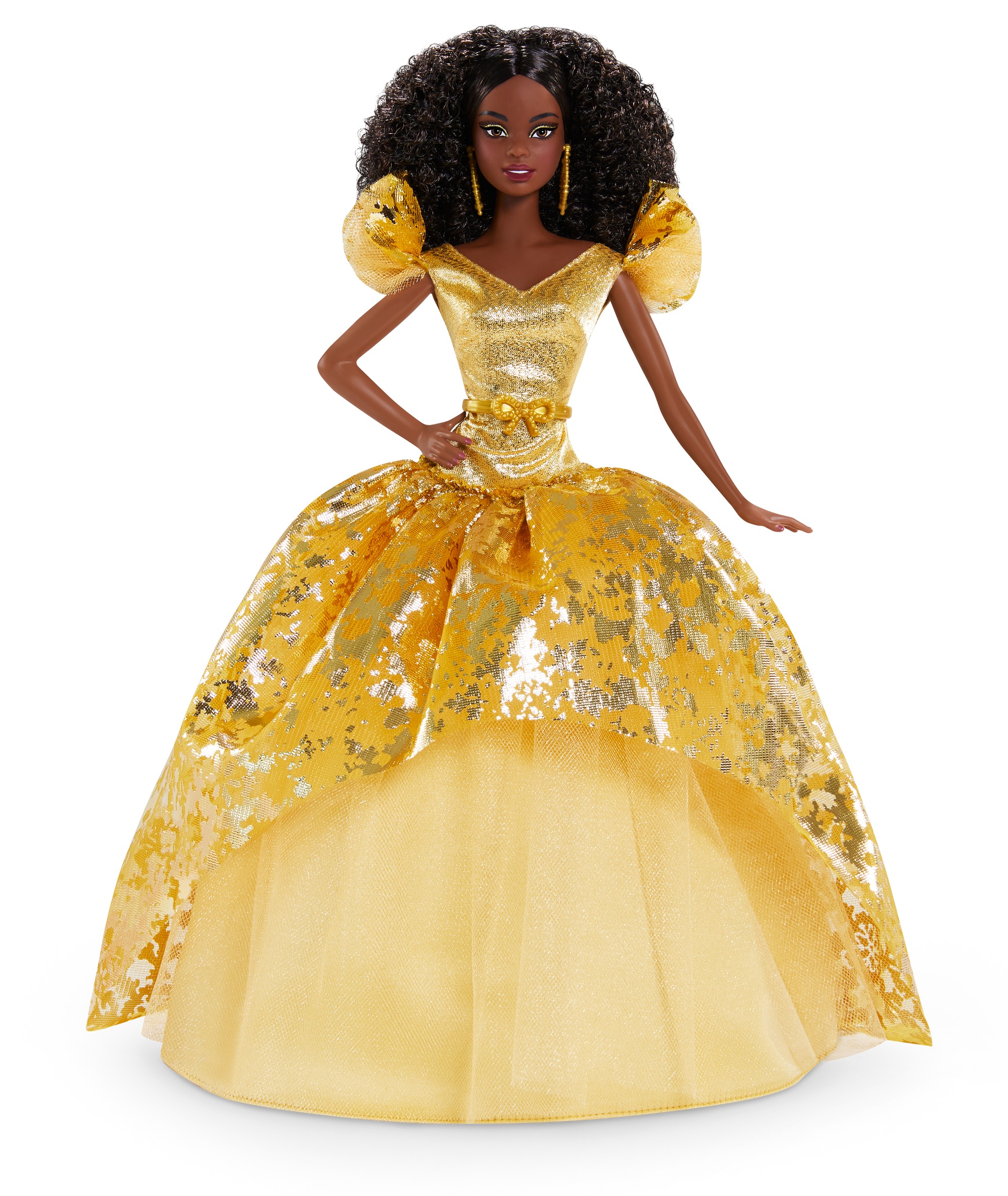 Cette poupée Barbie Joyeux Noël 2020 scintille dans son habit de fêtes : un bustier doré et scintillant aux manches volantées et une jupe en tulle avec un voile brillant décoré de flocons de neige. Une ceinture à nud et des boucles doreilles pendantes complètent ce look. Barbie est resplendissante avec son maquillage doré et pailleté et ses jolies boucles brunes. Présentée dans un emballage spécial du plus bel effet. Comprend un socle pour poupée et un certificat dauthenticité.