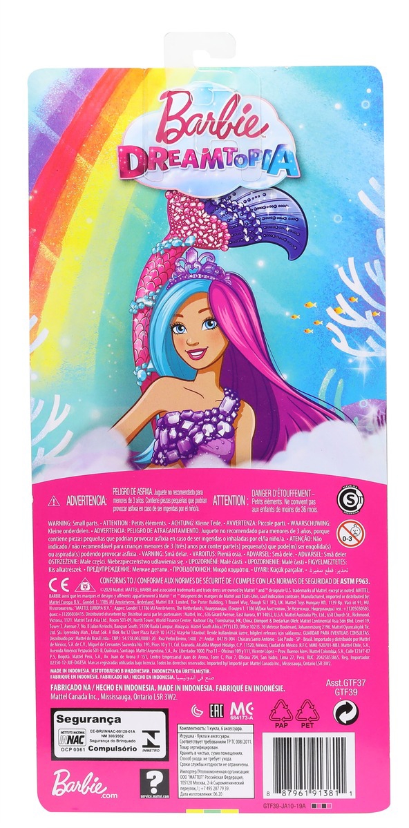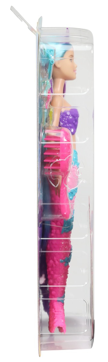 | Plus produit | Cette poupée Barbie Sirène Dreamtopia inspirera des histoires et des looks originaux avec ses cheveux multicolores extra-longs et les accessoires qui vont avec. § Brossez la longue chevelure colorée de cette Barbie sirène, puis choisissez son look du jour pour vivre de nouvelles aventures sous-marines ! § Les accessoires de coiffure comprennent une brosse à cheveux, 2 diadèmes, 2 barrettes et 2 peignes décoratifs, pour une multitude de looks. § Cette poupée Barbie sirène porte un corsage décoré de « joyaux » et une queue pailletée avec nageoire violette transparente. § Cette poupée Dreamtopia fera un super cadeau pour les enfants à partir de 3 ans, surtout sils aiment la coiffure et les sirènes ! |