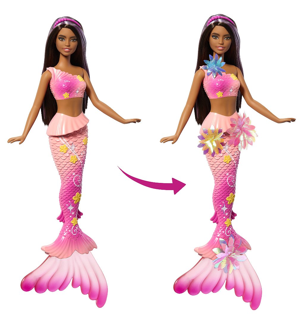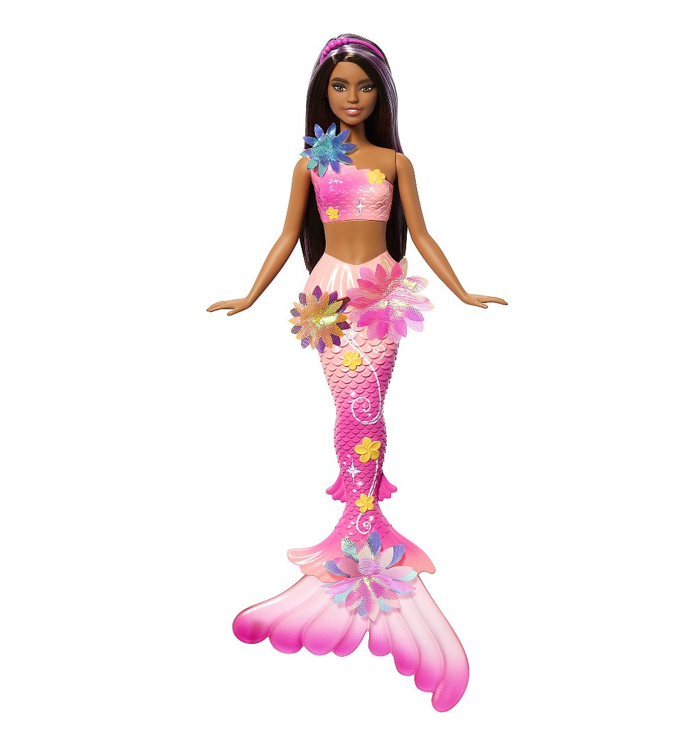 Faites éclore de belles histoires avec la poupée Barbie Sirène Fleur Magique ! Poussez le bouton à levier situé sur son dos pour voir les fleurs « éclore » comme par magie de son bustier à ses nageoires, encore et encore ! Les enfants peuvent également jouer avec cette poupée dans l’eau pour une magnifique éclosion sous-marine. Avec ses fleurs irisées, ses nageoires aux couleurs dégradées et son serre-tête perlé qui orne ses superbes longs cheveux bruns méchés de violet, cette poupée Barbie sirène rappelle la beauté des fonds marins. La poupée ne peut ni nager ni tenir debout toute seule. Les couleurs et les décorations peuvent varier.