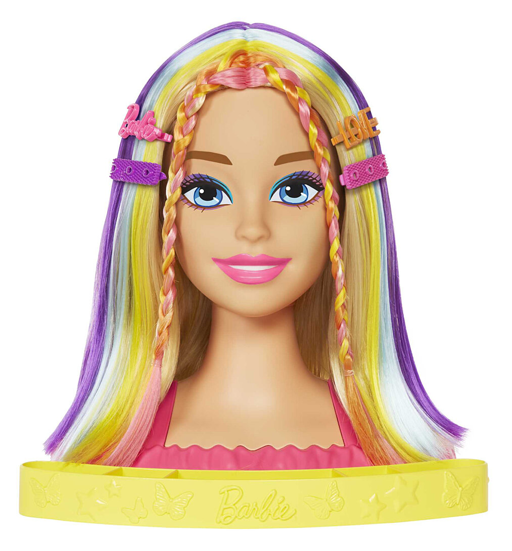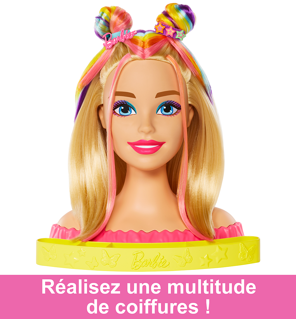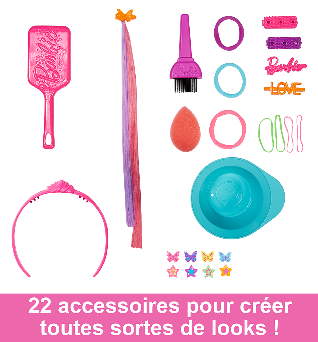 | Plus produit | Avec les têtes à coiffer Barbie® Ultra Chevelure, transformez nimporte quelle pièce en salon de coiffure ! Avec 22 accessoires, dont 10 éléments qui changent de couleur, les enfants peuvent créer une multitude de coiffures.\nBarbie® a des cheveux blonds lisses sublimés par des mèches reprenant chacune une couleur de larc-en-ciel ! Chignons, tresses, décorations colorées : tous les styles de coiffure sont à portée de main.\nLes lèvres changent de couleur, ainsi quune extension capillaire et huit décorations étoiles et papillons Color Reveal à fixer, pour dix surprises irrésistibles.\nPlongez les décorations pour cheveux Color Reveal dans leau chaude et remuez pour découvrir leurs vraies couleurs. Mouillez ensuite léponge incluse avec de leau glacée et passez-la sur les décorations pour révéler un nouveau détail !\nRemplissez le bol de coloration capillaire deau glacée. Trempez le pinceau et léponge dedans, puis passez-les sur lextension capillaire et les lèvres. Leurs couleurs changent, cest magique ! |