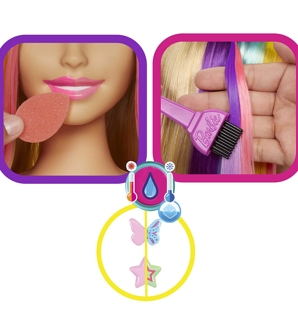 | La boîte contient | Inclut 1 tête à coiffer Barbie® avec base à compartiments, 1 brosse à cheveux, 1 pinceau de coloration, 1 bol de coloration, 1 éponge de maquillage, 4 barrettes personnalisables, 8 décorations Color Reveal à fixer, 1 extension capillaire qui change de couleur, 1 serre-tête personnalisable et 6 élastiques. Autres poupées et coffrets vendus séparément. Certains produits peuvent ne pas être commercialisés. |
