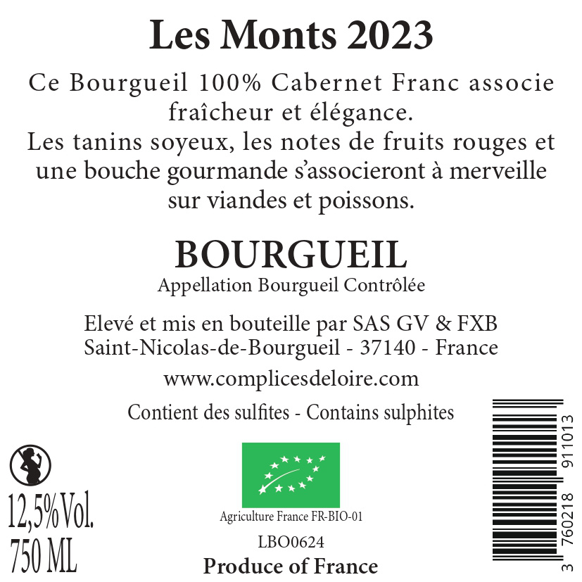 | Libellé | Barc & Vallée Les Monts BIO, 2023 - Bourgueil AOP - Rouge - 75 cl |