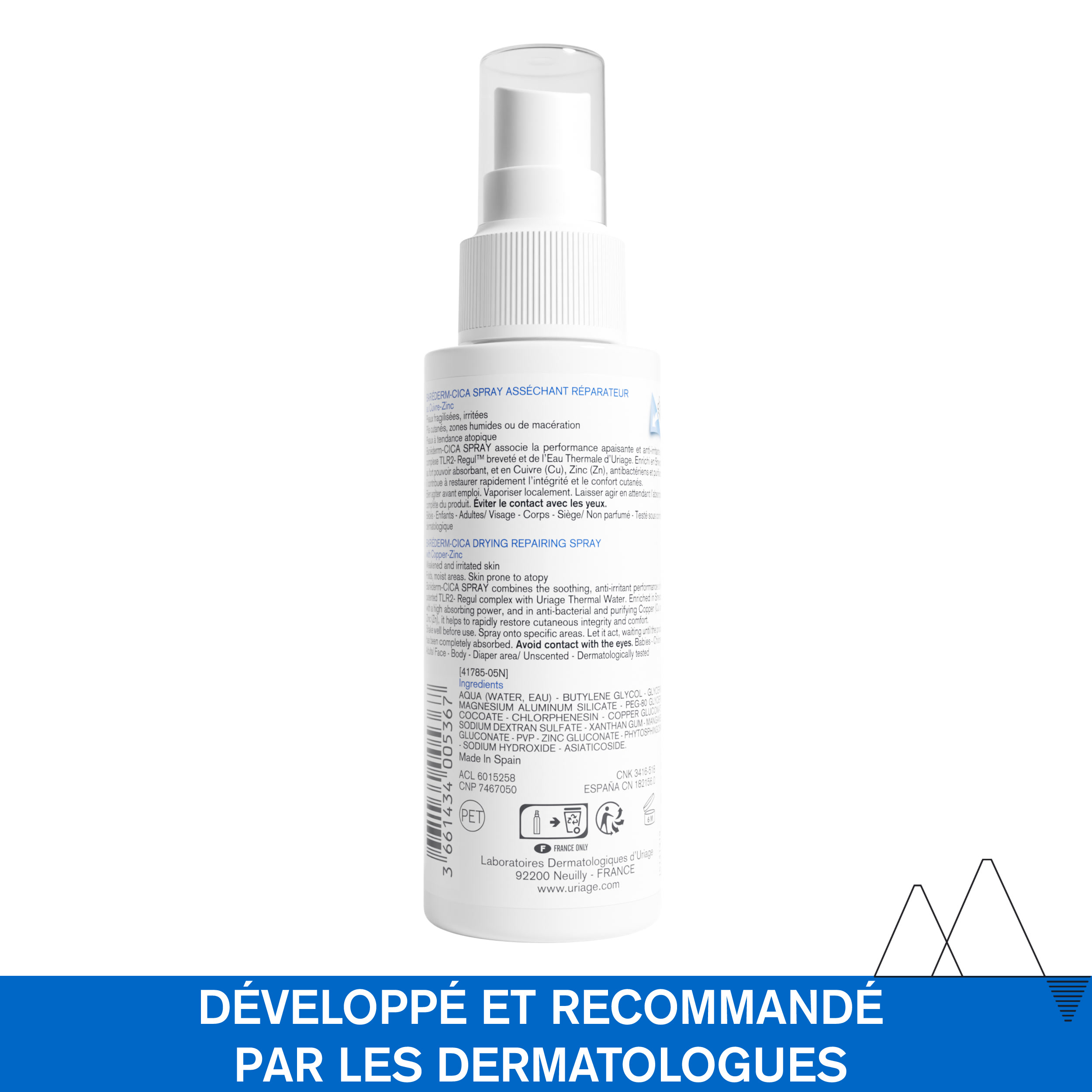 Bariéderm Cica-Spray Asséchant Réparateur est pratique et hygiénique. Haute-tolérance, il convient aux zones humides fragilisées. Apaise La technologie brevetée TLR2-Regul et l'Eau Thermale d'Uriage apaisent les épidermes fragilisés. Assainit Le Gluconate de Cuivre et l’Oxyde de Zinc régulent la flore cutanée bactérienne. Absorbe La smectite absorbe les excès d’humidité et assèche les zones humides, suintantes ainsi que les zones de macération et de plis cutanés.