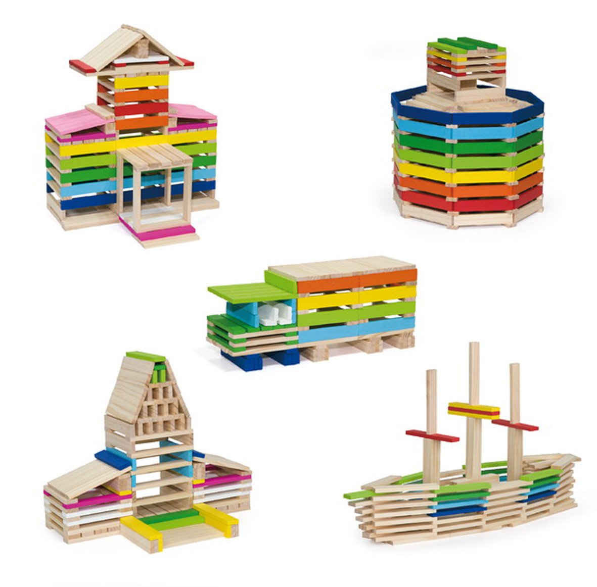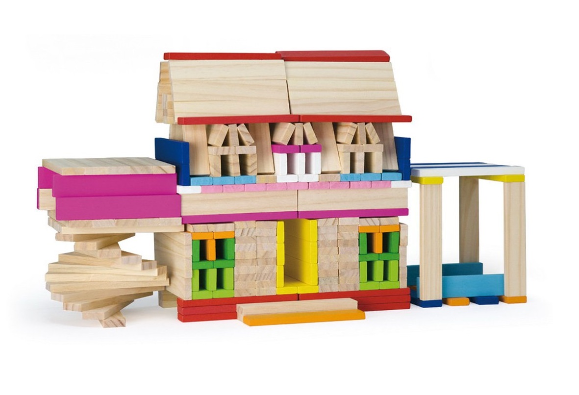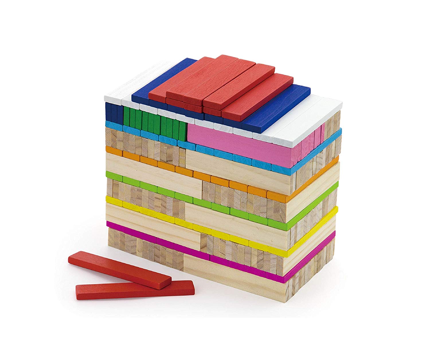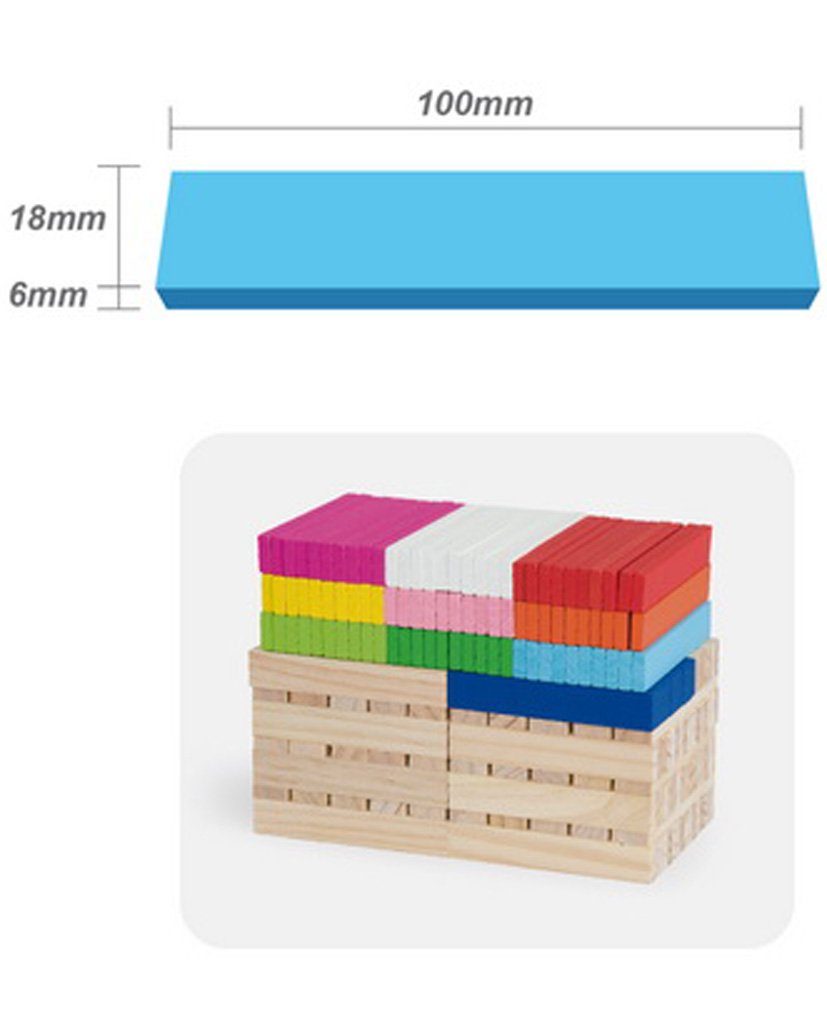 Cet ensemble de 250 planchettes est composé de 150 pièces en bois naturel et 100 pièces en bois coloré de 10 couleurs différentes.