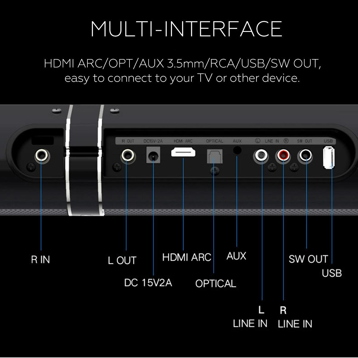 • Type d'interface : HDMI ARC, interface 3.5, fibre optique, interface RCA, interface de caisson de basses, interface USB