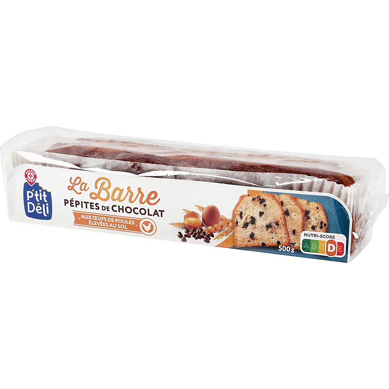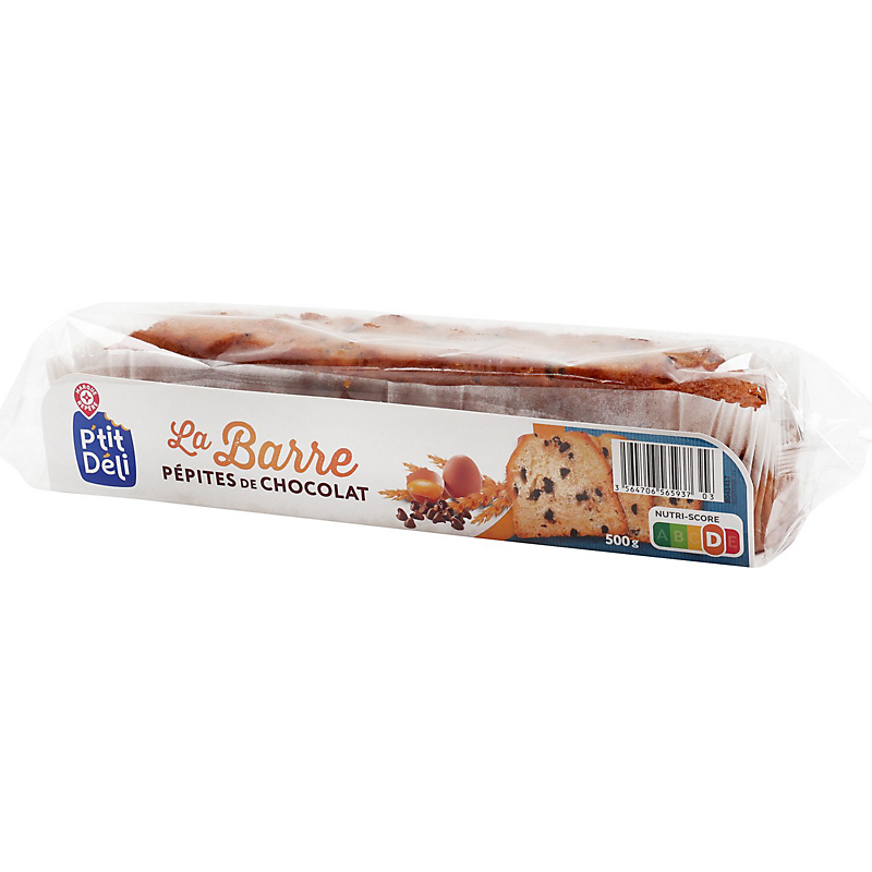 Ingrédients : Farine de blé 22% ; sucre ; huile de colza ; œufs 14% ; pépites de chocolat 12% [sucre, pâte de cacao, beurre de cacao, émulsifiant : lécithines (soja)] ; stabilisant : glycérol ; fécule de manioc ; poudres à lever : E450, E500 (dont blé); arôme naturel de vanille (contient alcool) ; sel ; arôme naturel.