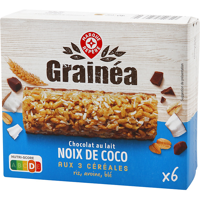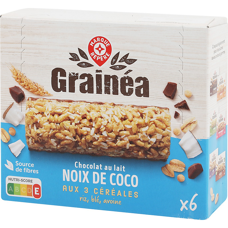 Barre de céréales (35 %) au chocolat au lait et à la noix de coco râpée, aromatisée GRAINEA