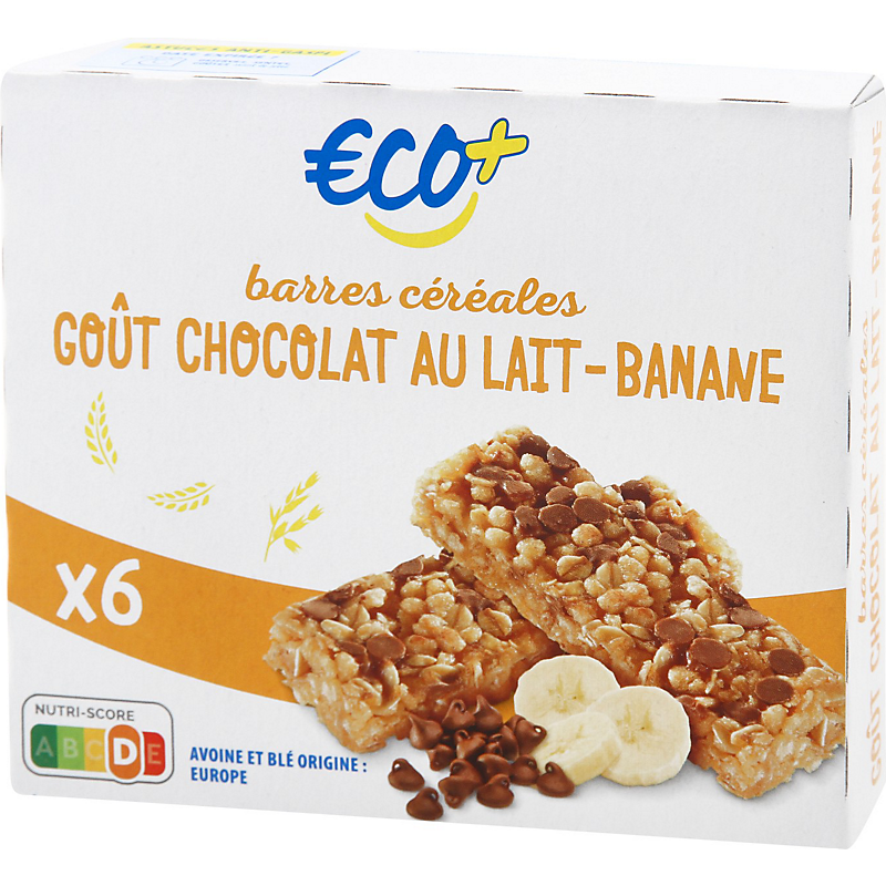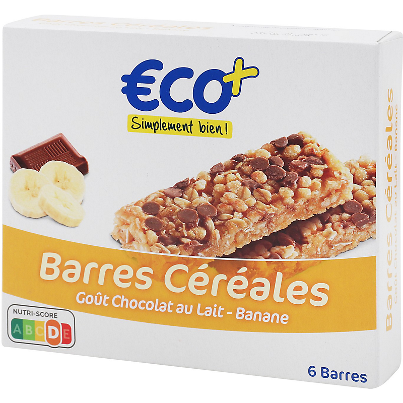 Barres de céréales aux pépites de chocolat au lait et à la banane, aromatisées ECO +