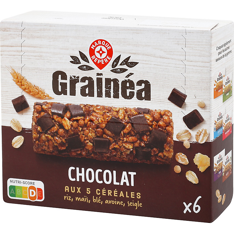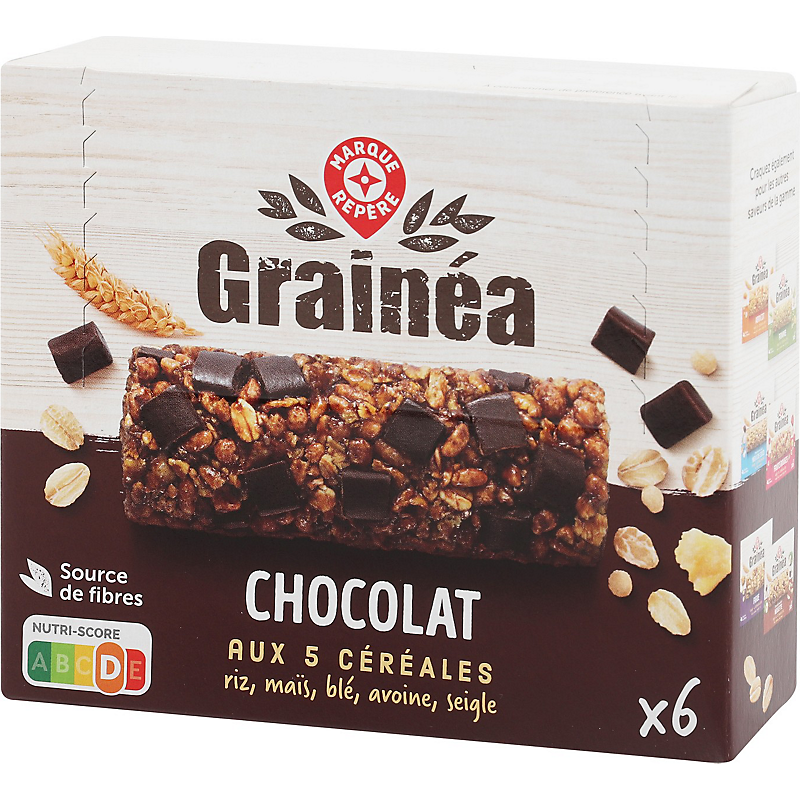 Ingrédients : Sirop de glucose, morceaux de chocolat noir 13 % [pâte de cacao, sucre, beurre de cacao], farine de riz 11,5 %, maïs 10,4 %, farine de blé 6,7 %, flocons d'avoine 5,8 %, huile de tournesol, chocolat noir 3,1 % [sucre, pâte de cacao, beurre de cacao, arôme naturel de vanille, émulsifiant : lécithines (soja)], flocons de seigle 2,7 %, stabilisant : sorbitols, cacao maigre en poudre 1,8 %, sucre, dextrose, malt de blé, sel, gluten de blé, extrait de malt d'orge, émulsifiant : lécithines (soja), antioxydant : extrait riche en tocophérols, arôme naturel de noisette.