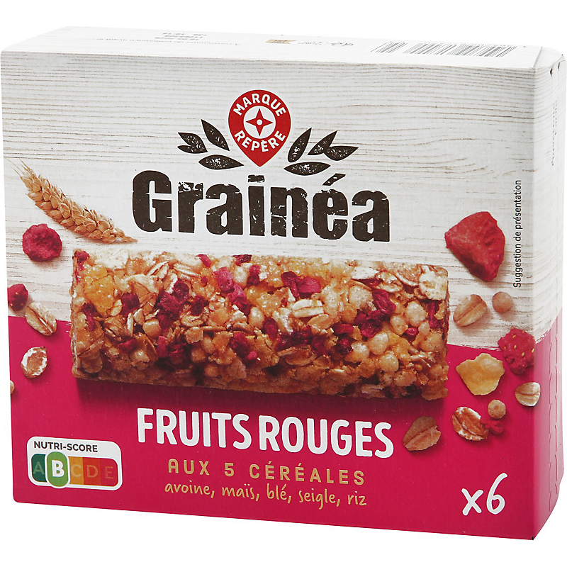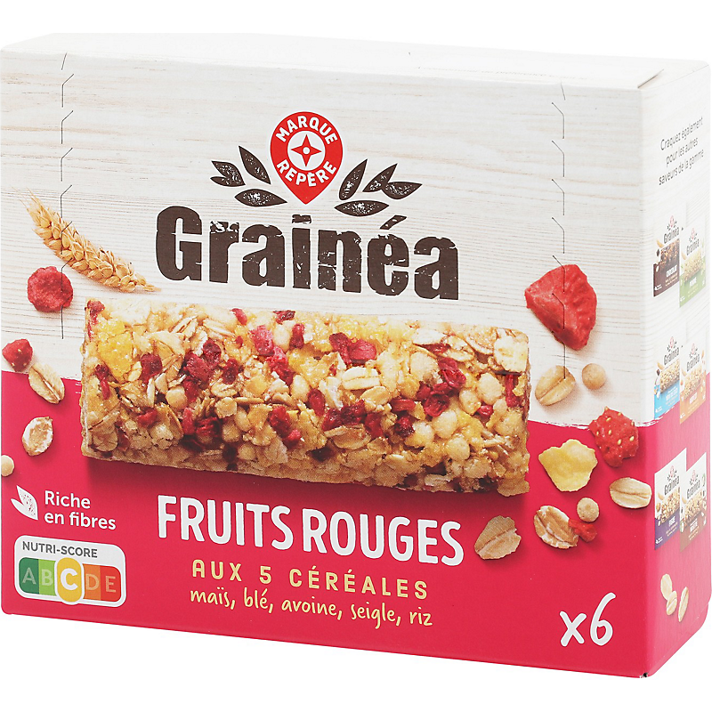 Barre de céréales (52 %) aux fruits rouges (4,7 %) lyophilisés, aromatisée GRAINEA