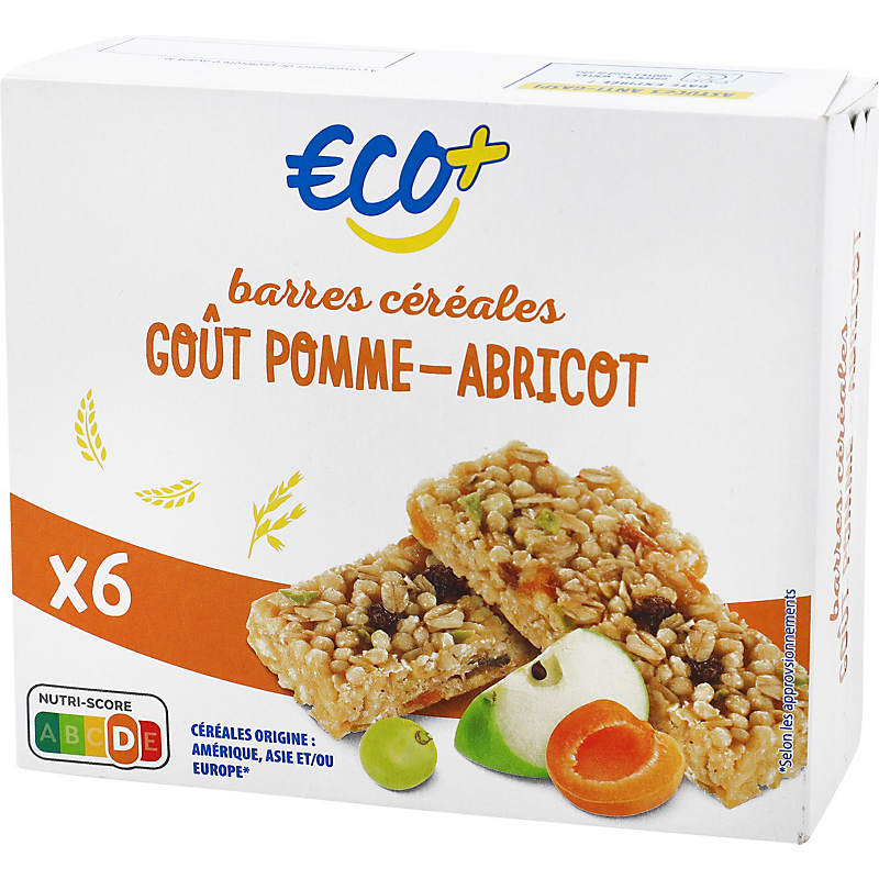 Barre de céréales (39,9 %) avec des morceaux de pommes séchées et de préparation à l'abricot, aromatisée ECO +