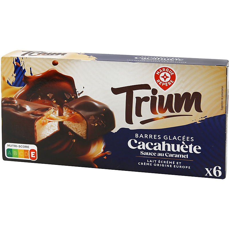 Crème glacée à la cacahuète (51,1 %) avec une sauce au caramel (11,4 %) et des cacahuètes grillées et salées (6,8 %) avec un enrobage au cacao (30,7 %) TRIUM
