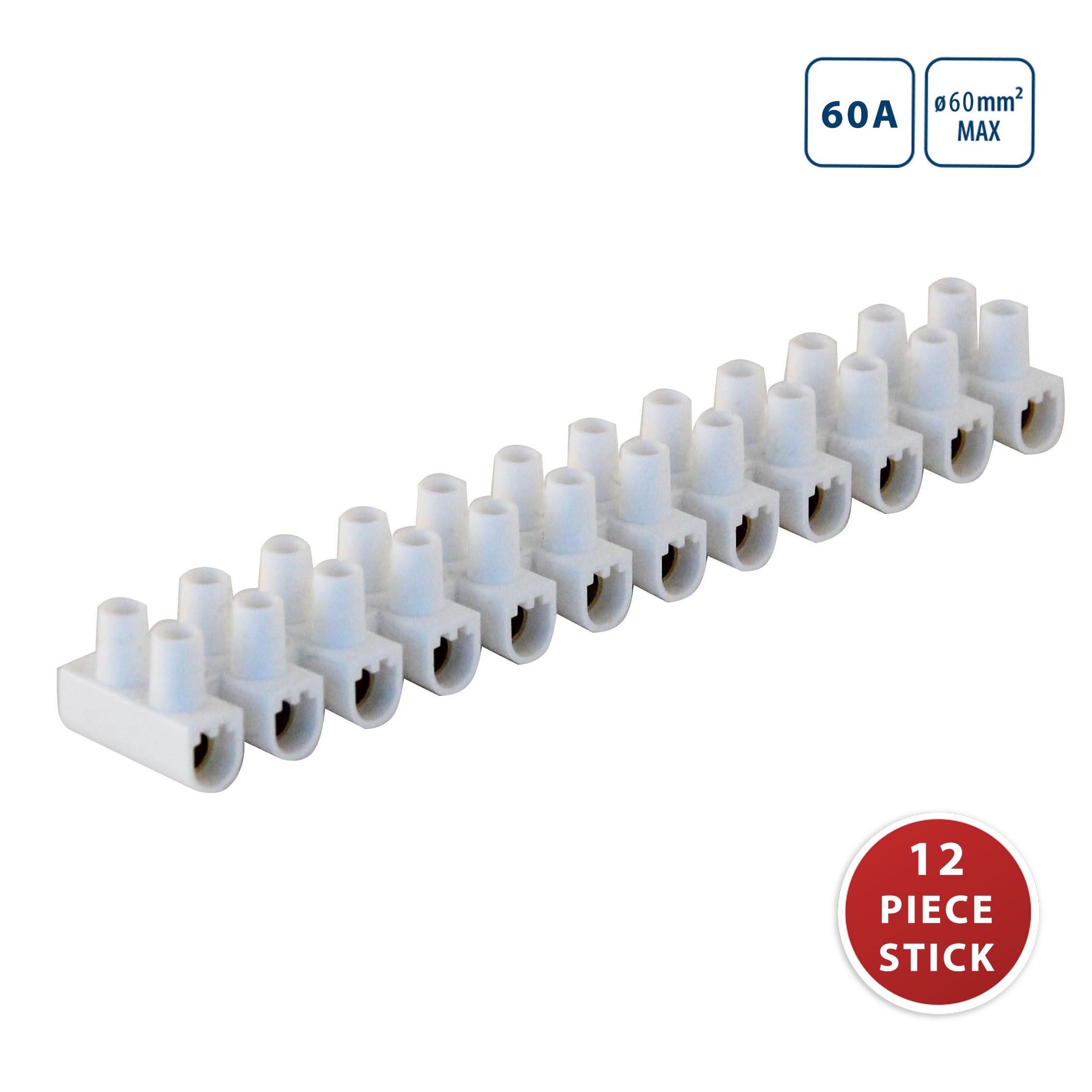 Pack de 12 borniers; divisible à la main. 25 mm2, 60A; vis de connexion des bornes à tête plate. Matériau: polypropylène PP, bonne flexibilité, transparence, extensibilité, résistance aux radiations. Assemblage rapide et facile. Certificat TUV et NF (normes françaises).