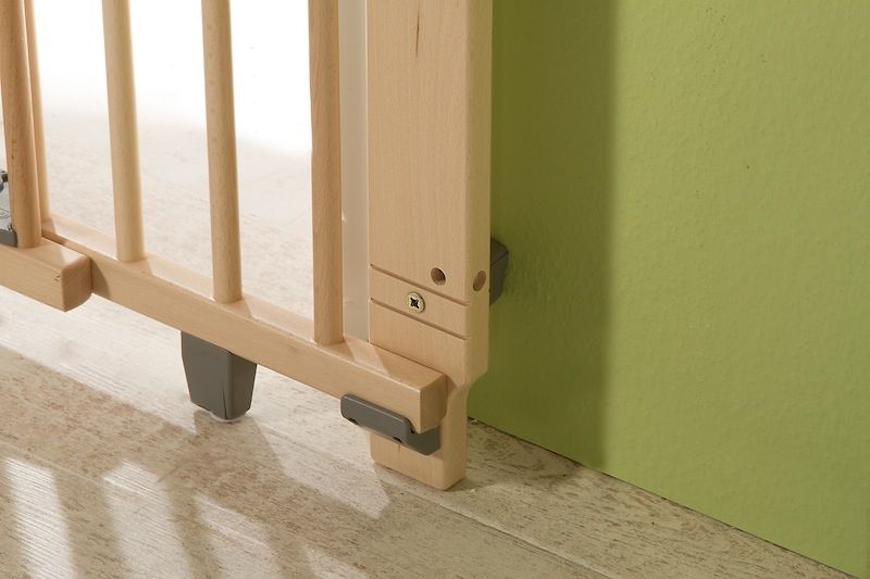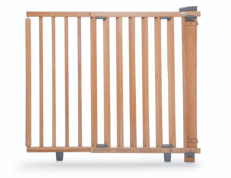 Barrière de sécurité+ pour portes-Hêtre massif certifié FSC-coloris : naturel - 2 zones de réglage : à l'intérieur du cadre de la porte : 93,5 à 133 cm- Devant le cadre de porte :86 à 121 cm-Hauteur 83 cm