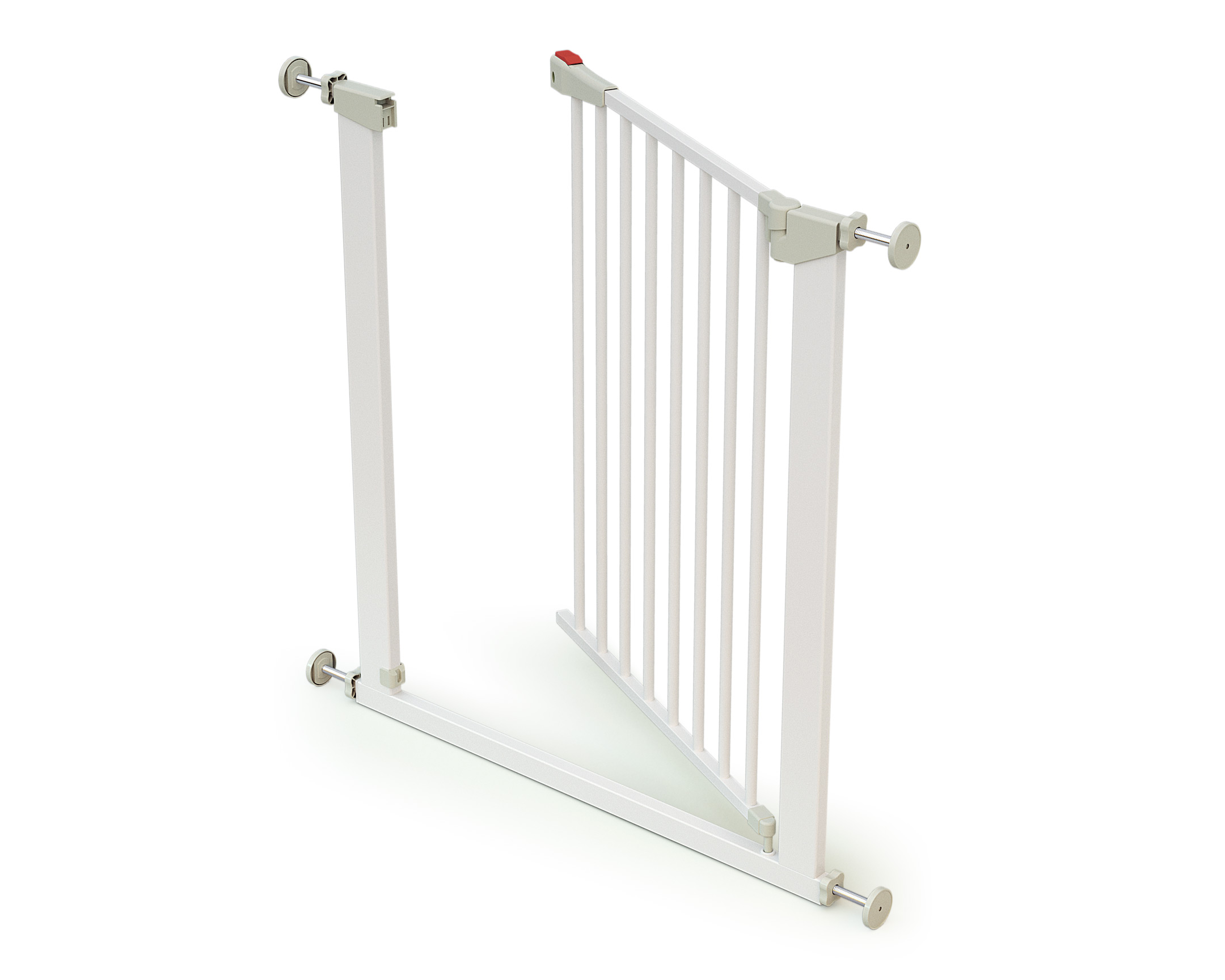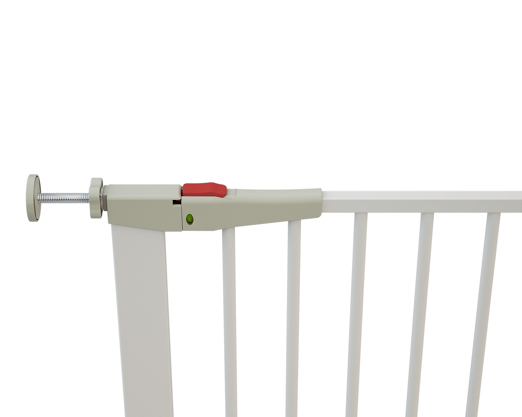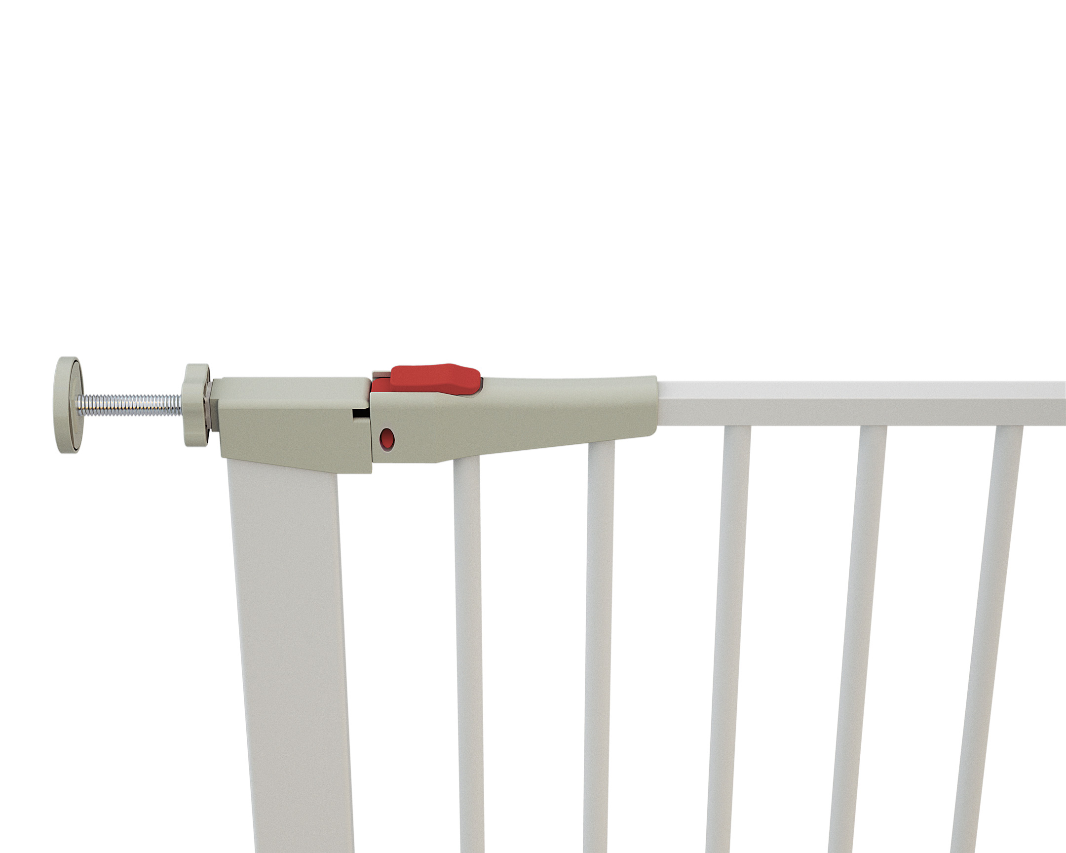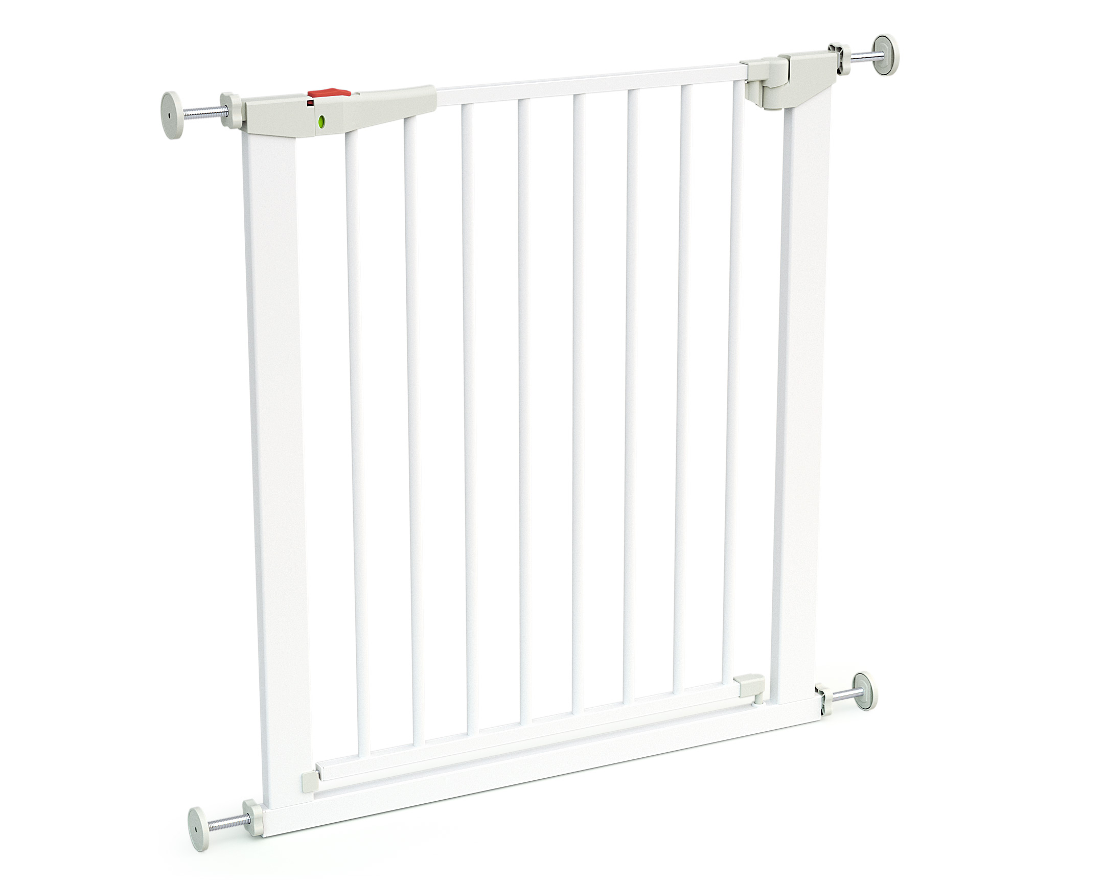 Barrière ajustable en métal. Elle s'adapte aux ouvertures comprises entre 72,5 et 79,5cm et s'ouvre des deux côtés d'une seule main. Son portillon est équipé d'un système de retour automatique.