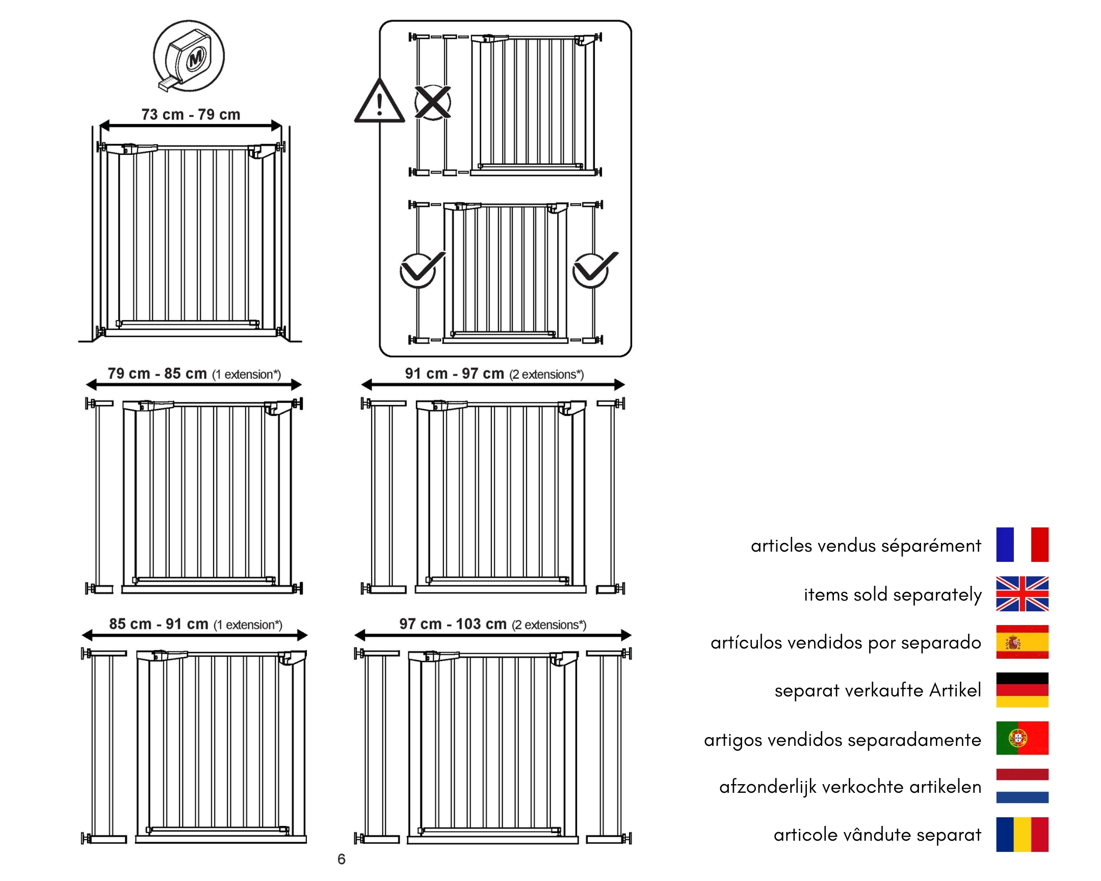 | Avertissements | <p><strong>INFOS PRATIQUES</strong></p> <p>Uniquement destinée à un usage domestique. Conçue pour les enfants de 24 mois et moins.</p> <p>Cette barrière de sécurité dispose d'un système de fermeture manuel. Fixation par perçage.</p> <p>La barrière doit être fixée sur une structure stable et solide. À fixer sur montant rigide : bois, brique, plâtre, pierre.</p> <p>À fixer avec des vis et chevilles (non inluses) adaptées aux montants.</p> <p><strong>AVERTISSEMENT</strong> : Lire les instructions avant installation car un mauvais montage peut s'avérer dangereux.</p> <p><strong>AVERTISSEMENT</strong> : Cette barrière de sécurité ne doit pas être montée en travers des ouvertures de fenêtres. À utiliser uniquement en travers d'un passage : porte, couloir, escalier.</p> <p><strong>AVERTISSEMENT</strong> : Ne pas utiliser cette barrière de sécurité sans ses coupelles de fixation. Livré en kit, à monter soi-même. .</p> |