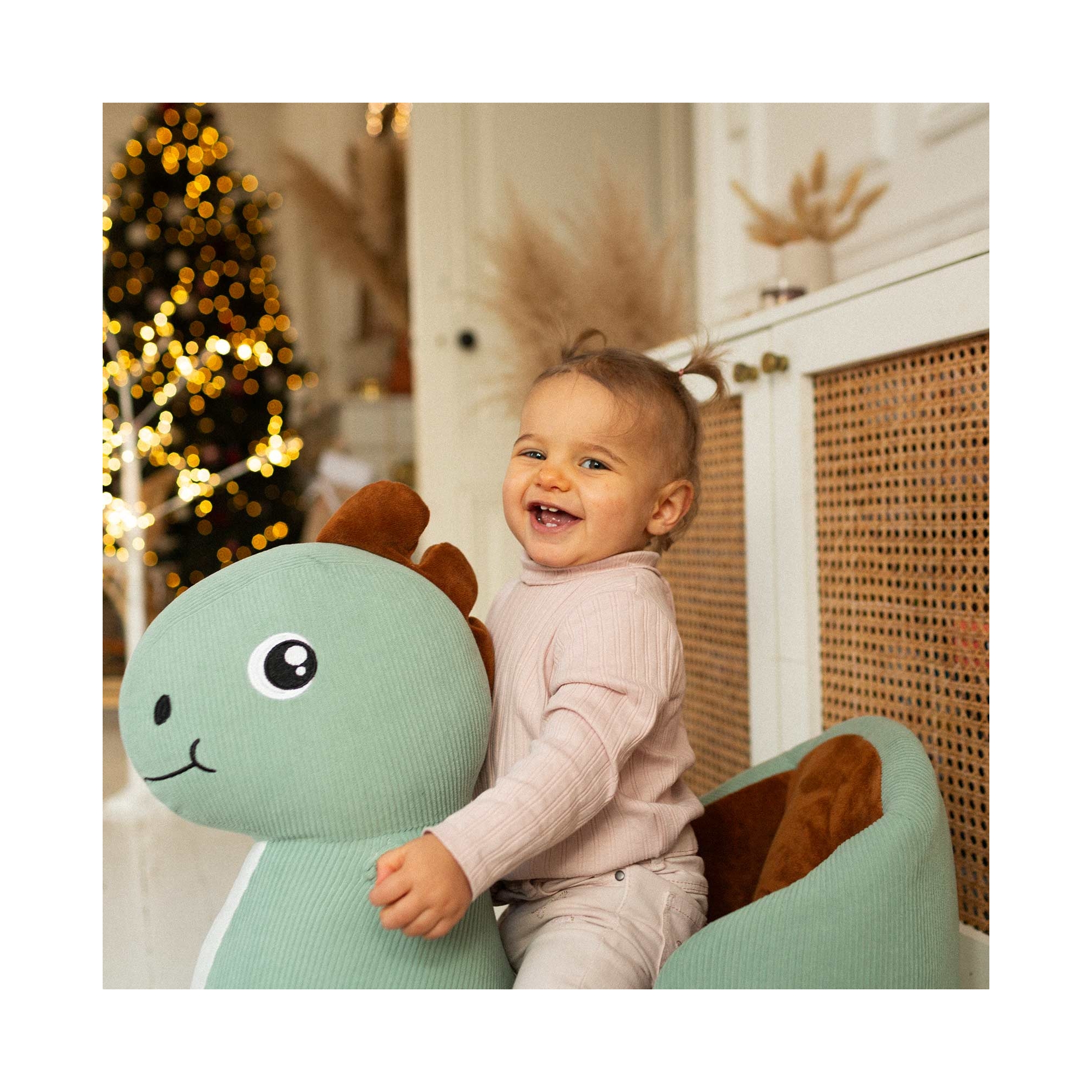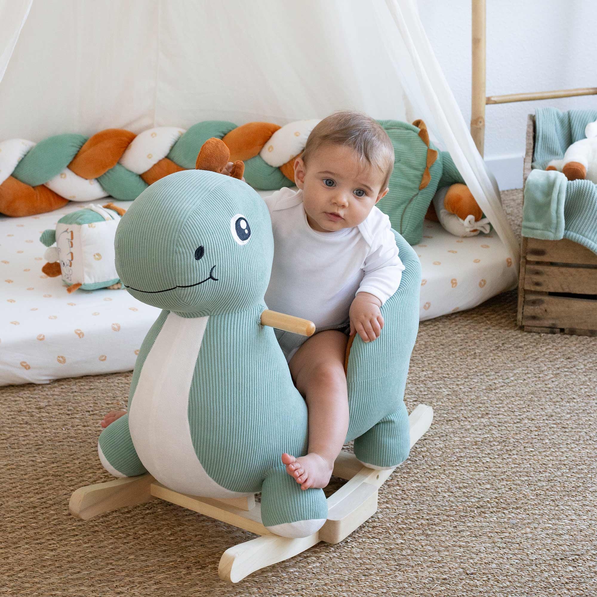 Cette bascule bébé est sécuritaire grâce à sa ceinture ajustable pour bébé. Aux couleurs tendances vert d'eau, écru et terracotta, cette bascule s'harmonisera avec tous les styles.