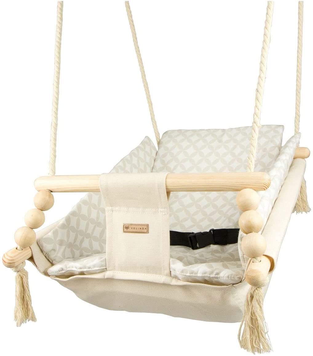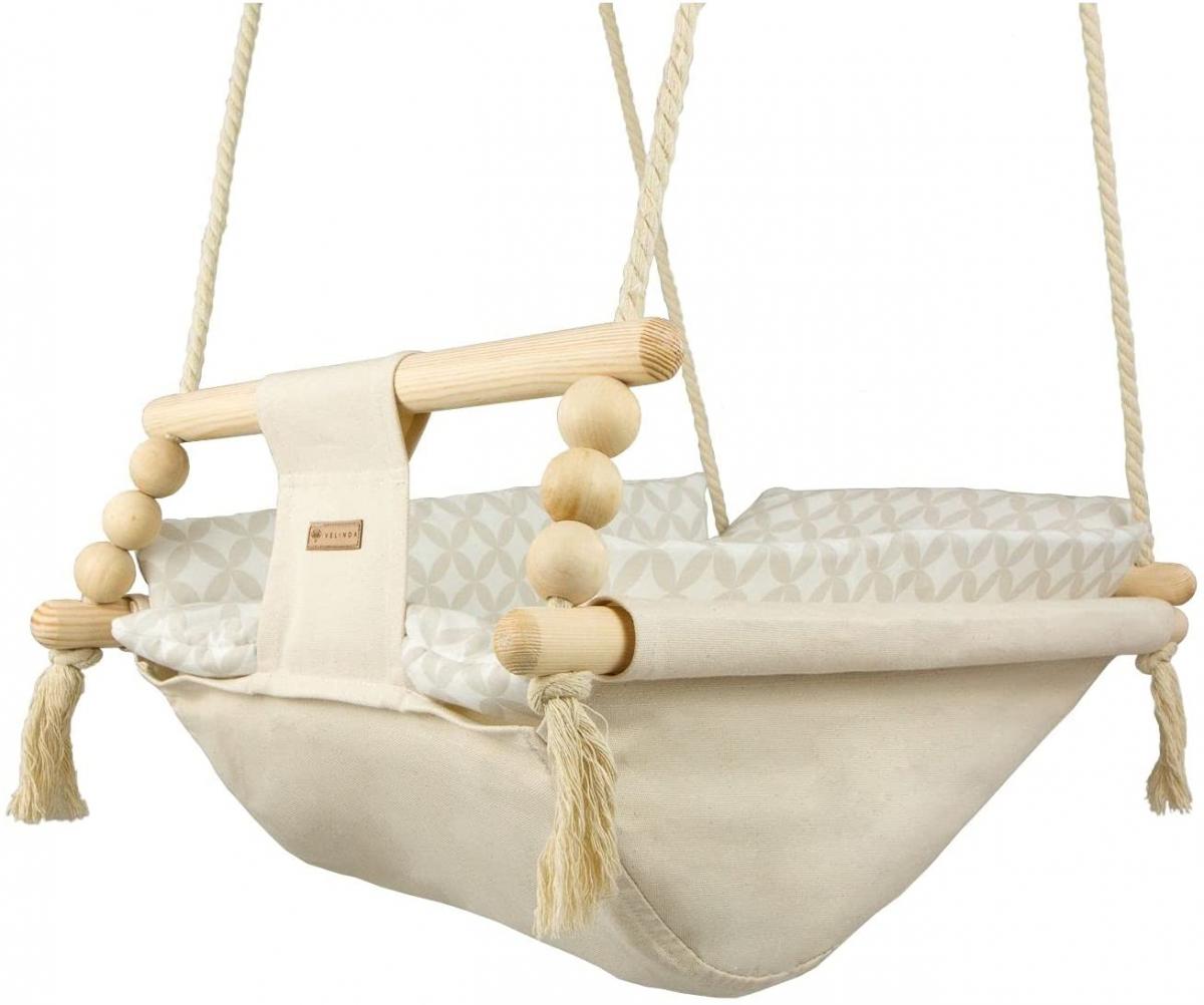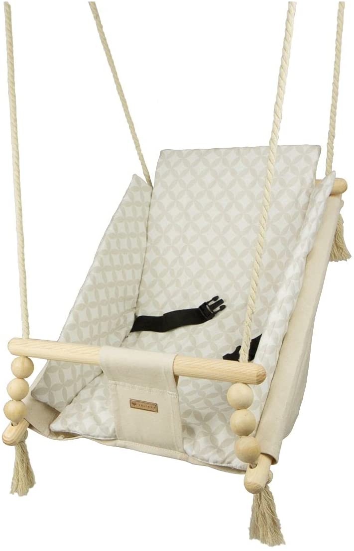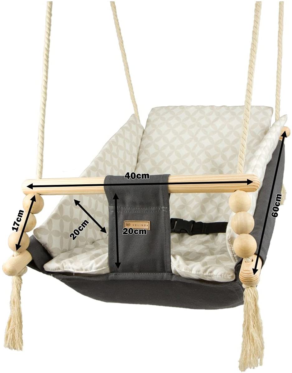 Les cordes en coton épais sont équipées de roues en métal qui permettent de monter la bascule sur la terrasse, le porche ou le jardin. Les boules en bois ne sont pas seulement décoratives, elles contribuent également au développement des compétences manuelles de l'enfant. La bascule est équipée d'une ceinture pour plus de sécurité. L'ensemble comprend également une courtepointe mesurant environ 35 x 40 cm, remplie de ouate 300 g/m2. Jouer sur la balançoire ne doit se faire que sous la surveillance d'un adulte. Les elements en coton peuvent être lavés en machine a 30oC. Poids max.: 20kg Âge de l'enfant: + 2 mois Matériel: cadre en bois. cordes et assise 100% coton La longueur des cordes environ 1,5 m, diametre environ 10 mm