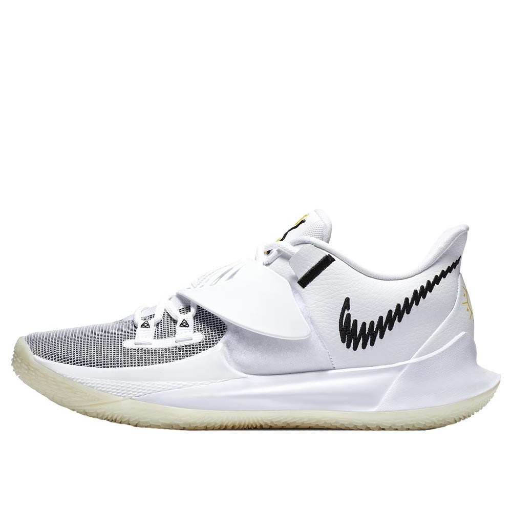 Lors d'une éclipse solaire totale, la lumière du jour et l'obscurité de la nuit ne font plus qu'une. La Kyrie Low 3 « Eclipse » représente l'équilibre entre les opposés avec des motifs complexes sur la pointe et la sangle, et une crête jaune sur le talon. Amortissement d'air dynamique L'amorti Zoom Air à l'avant-pied et au talon se comprime sous la pression, puis se dilate, restituant l'énergie que vous mettez pendant que vous jouez. Fermeture à sangle, ajustement sécurisé Une sangle élastique profilée au milieu du pied s'enroule autour des lacets pour un ajustement parfait. Adhérence sur les bords La semelle extérieure en caoutchouc enveloppe les côtés pour une adhérence supplémentaire. Plus d'avantages Le mesh à l'avant-pied est léger et respirant. La semelle intermédiaire en mousse profilée offre une transition douce du pied et un look aérodynamique. Détails du produit Semelle extérieure en caoutchouc durable. Tige en cuir naturel et synthétique et tissu. Le produit n'est pas destiné à être utilisé comme vêtement de protection. Couleur présentée : Blanc/Noir Modèle : CJ1286-100 Le troisième modèle discret de Kyrie Kyrie Irving est un maître dans l'art d'effectuer des changements soudains avec le ballon. La Kyrie Low 3 offre une traction multidirectionnelle et permet aux joueurs agiles d'effectuer des coupes rapides sans sacrifier l'amorti. Ce modèle à profil bas est doté d'une bande de roulement en caoutchouc agressive qui enveloppe les côtés de la chaussure et d'une sangle au milieu du pied pour une sensation de sécurité sur le terrain.