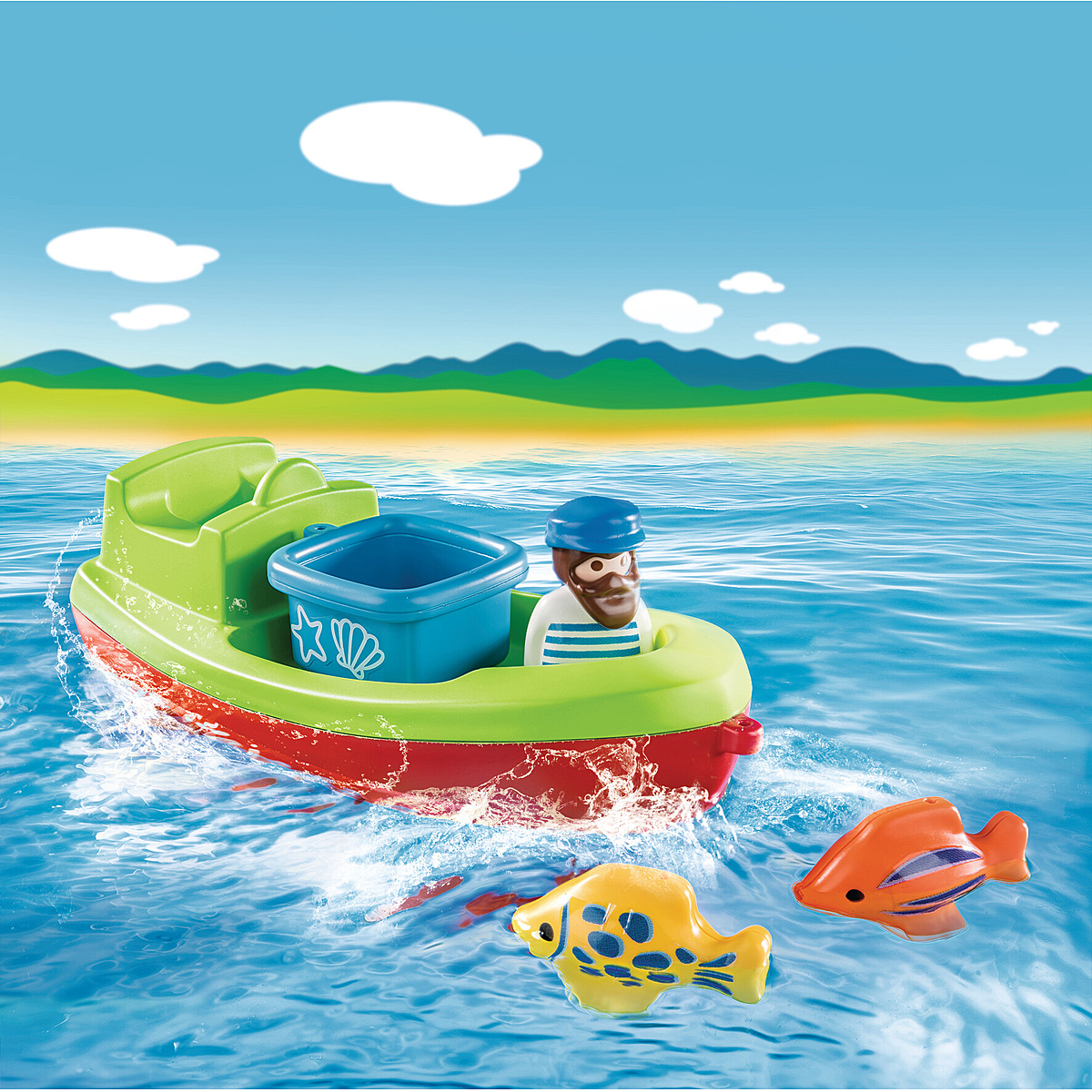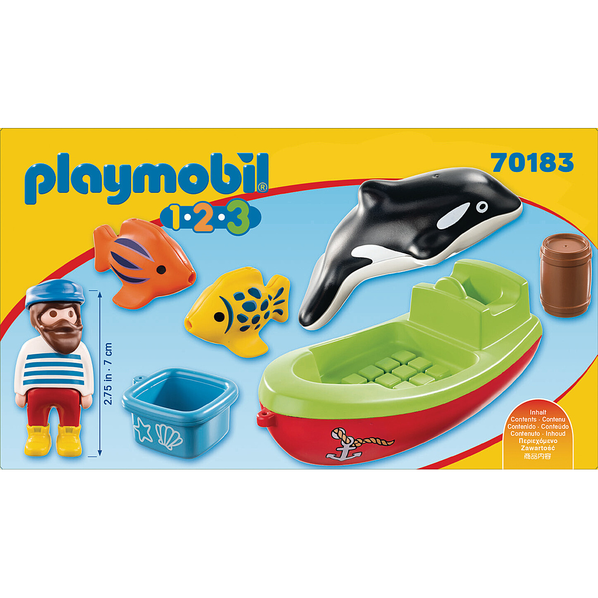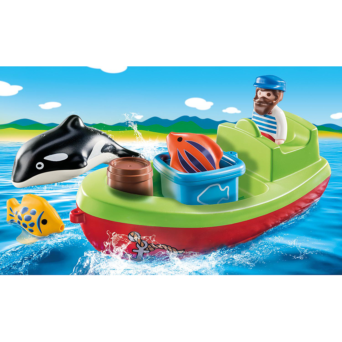 Marée haute ! Le marin à bord de son bateau de pêche observe les poissons et l'orque. Le bateau flotte. Jeu de formes avec le tonneau et la caisse. Les PLAYMOBIL 1.2.3 sont colorés avec des formes arrondies, ils aident les enfants à se développer et à apprendre en jouant.