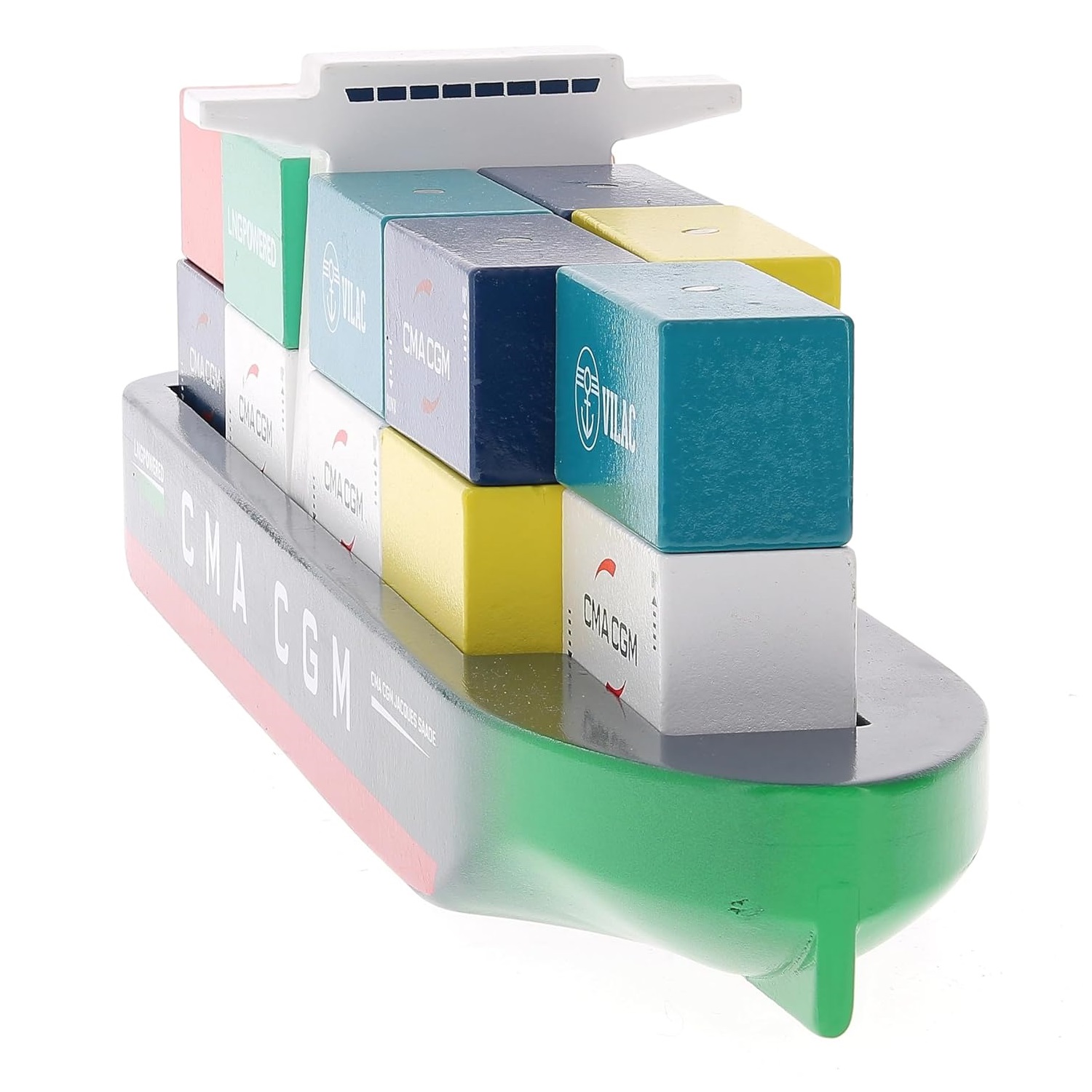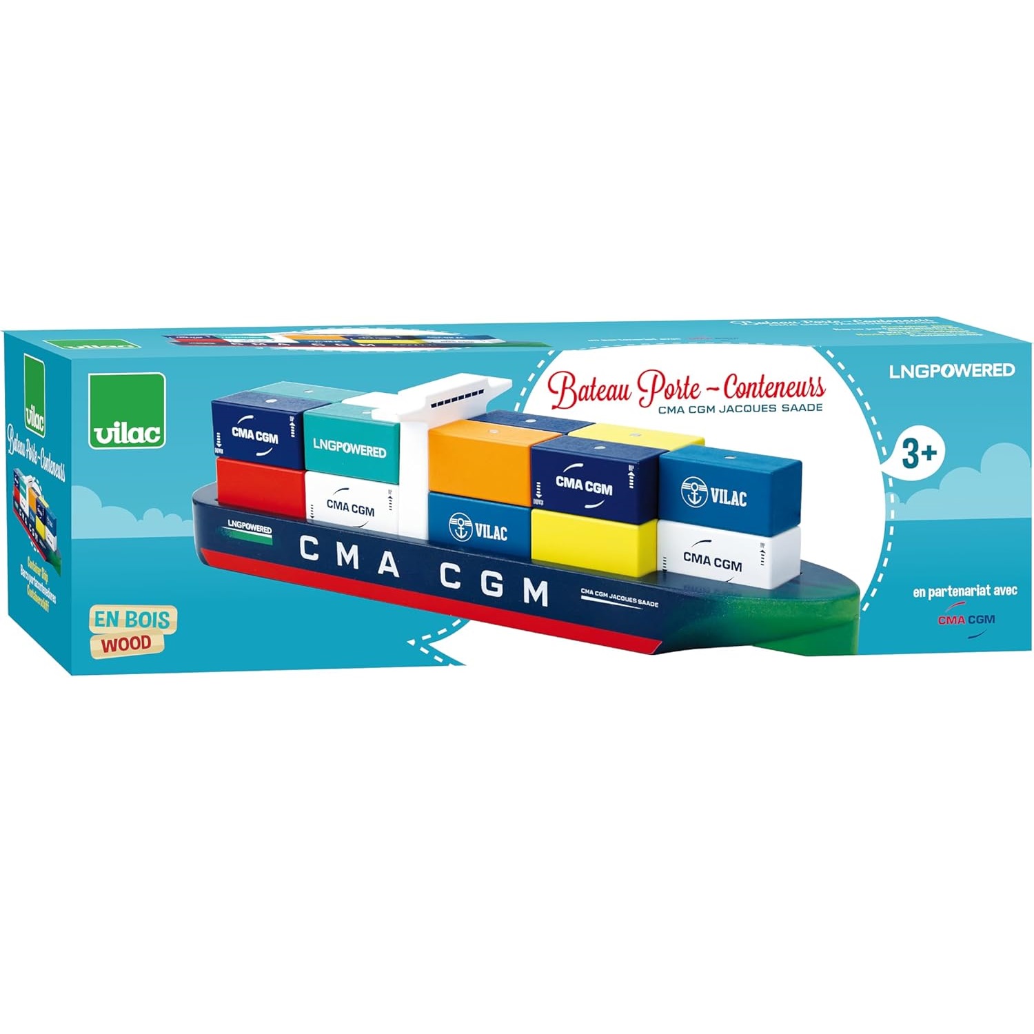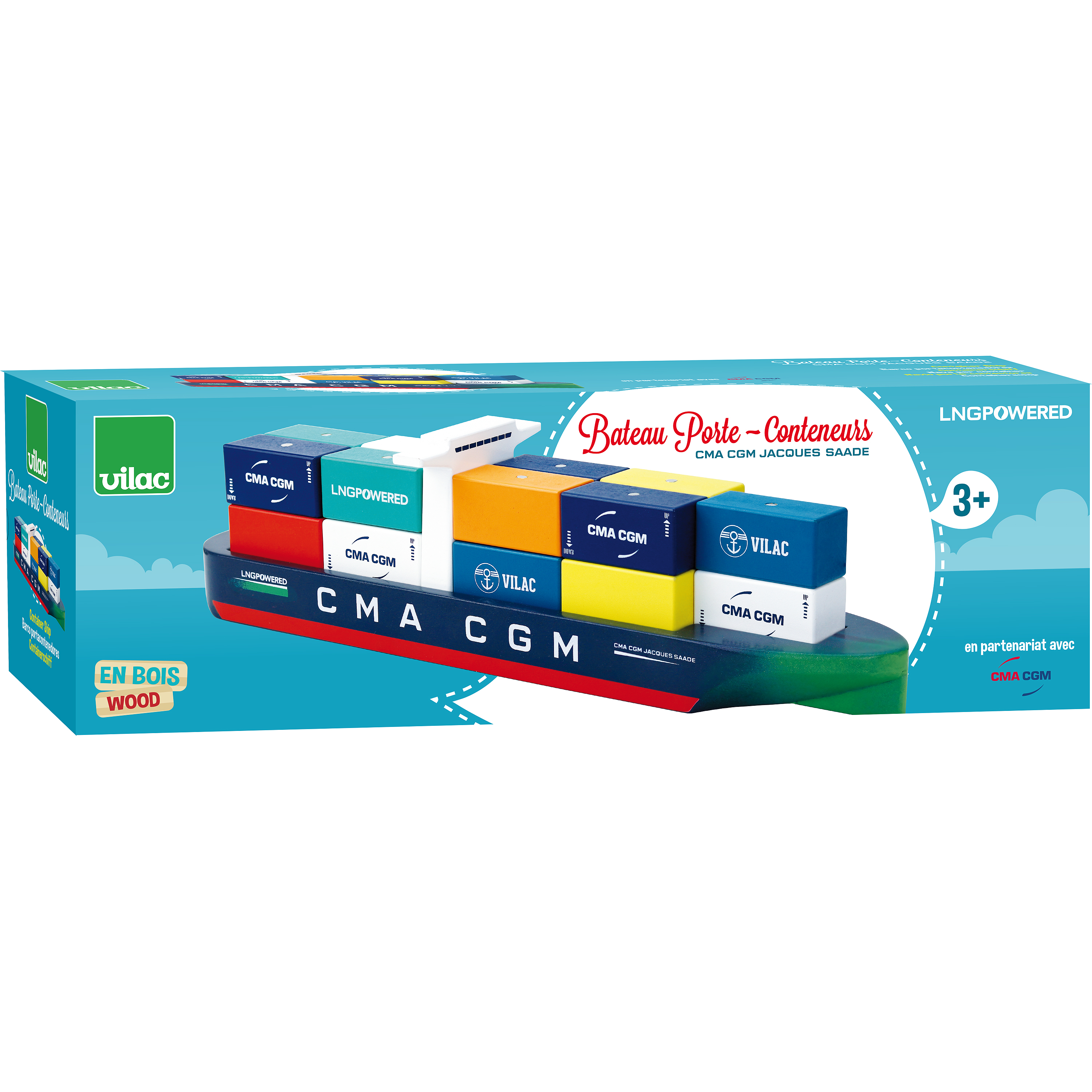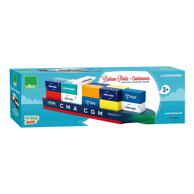 Créé en collaboration avec CMA CGM, ce navire Vilac est une ré-interprétation du tout nouveau bateau porte-conteneurs CMA-CGM Jacques Saadé, premier navire de ce type à propulsion écologique au GNL, Gaz Naturel Liquide reconnaissable à son inscriprion « LNG powered » sur la coque. Compatible avec notre gamme Vilacity, ce nouveau jouet Vilac est doté de dix-huits conteneurs aimantés à charger et décharger avec la grue sur le semi-remorque (vendus séparément) Vilac 2356S - Jeu d'imitation - En bois - Dès 3 ans.