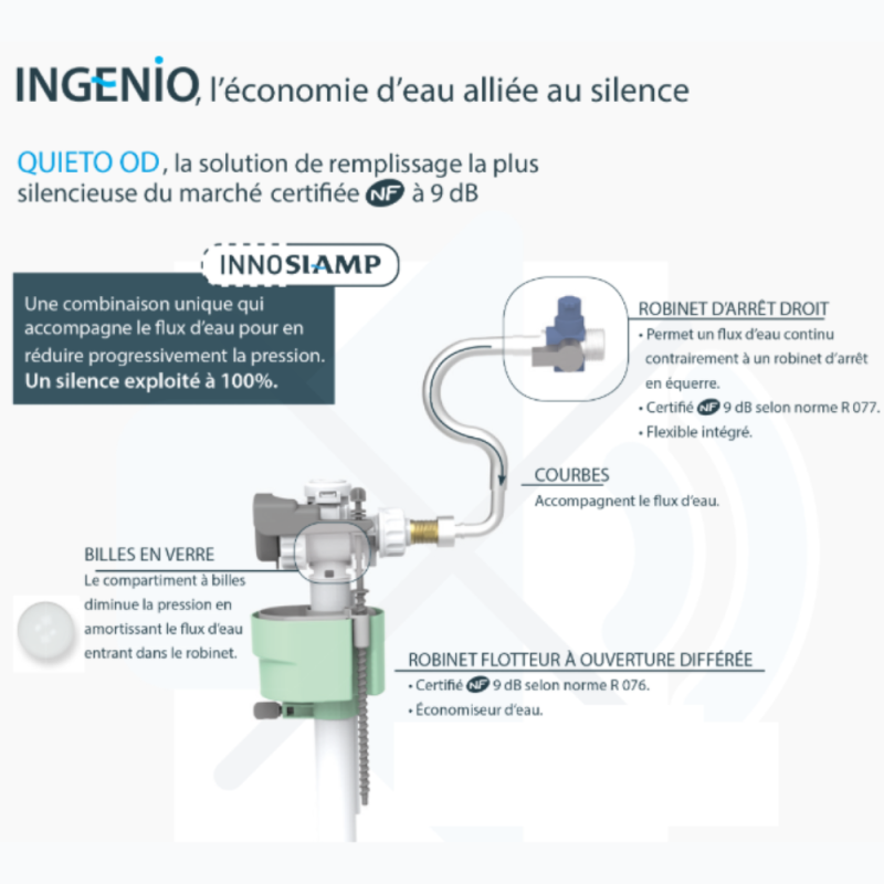 économiseur d'eau à ouverture diff érée hyper silencieux NF 10 dB, fi ltre de protection du réservoir.