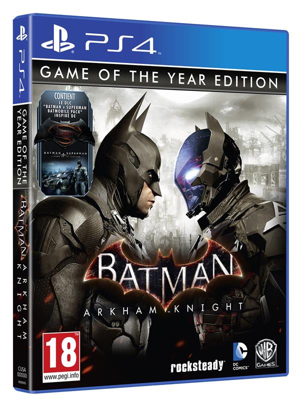 Batman: Arkham Knight constitue le dernier volet de la trilogie récompensée des Batman: Arkham, développée par Rocksteady Studios. Développé exclusivement pour les plateformes nouvelle génération, Batman: Arkham Knight présente par ailleurs une version inédite, conçue par Rocksteady, de la Batmobile. L'ajout très attendu de ce véhicule légendaire, combiné au gameplay salué par la critique de la série des Batman Arkham, offre aux joueurs une expérience de jeu Batman complète et inoubliable alors qu'ils parcourront tout Gotham City, sur terre et dans les airs. Dans ce final explosif, Batman affronte la menace ultime qui pèse sur la ville qu'il a juré de protéger. L'Épouvantail est de retour et, avec lui, un nombre impressionnant de super-vilains.